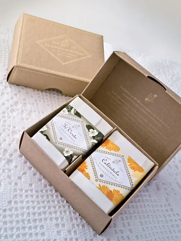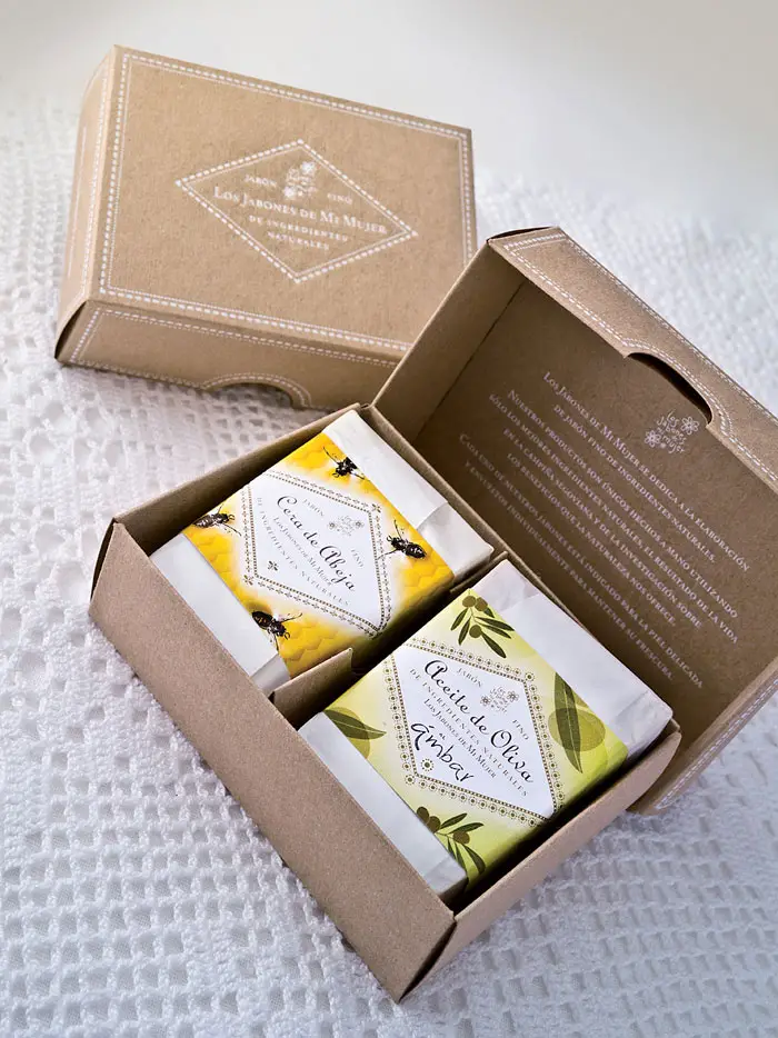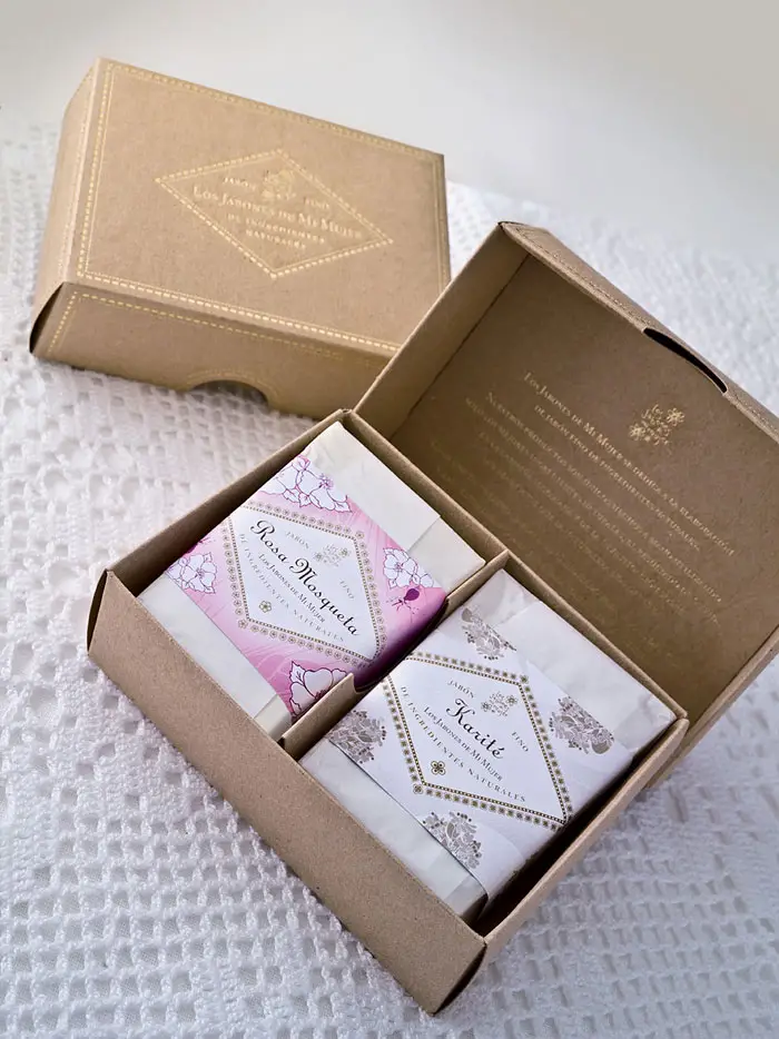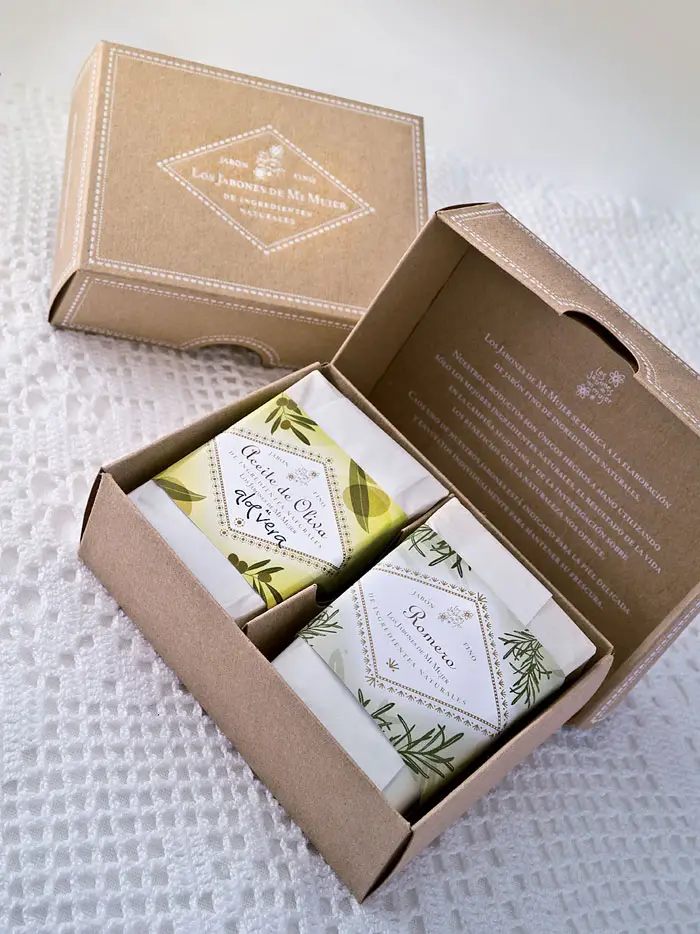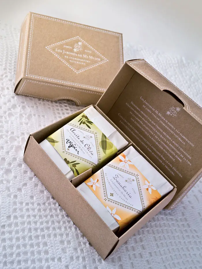 Cada pastilla se elabora, corta y envuelve manual e individualmente. A la hora de elegir, es posible hacerlo entre diferentes sets de dos jabones, cada uno de un aroma diferente. Así, es posible decidirse entre rosa mosqueta+karité, aloe vera+romero, aceite de argán+zanahoria con neroli, cacao+arcilla verde, cera de abeja+ámbar y té verde+caléndula. Cada dúo cuesta 25 euros.