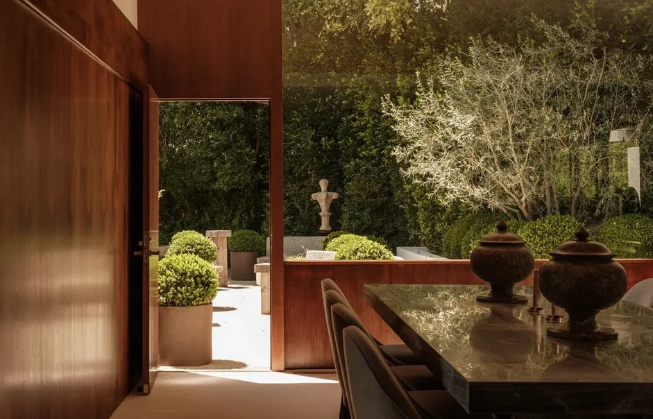 ¿Y cómo es la la casa en cuestión? Se trata de una vivienda construida en 1955 y es un diseño de Richard Neutra, uno de los más notables arquitectos de la arquitectura moderna; está en Bel Air y por supuesto ha sido debidamente restaurada a lo largo de los años respetando profundamente el diseño original (y genial) de Neutra. La Casa Brown, que así se llama, es una casa con vistas sobre Los Ángeles, suelos de terrazo, paredes de cristal, jardines románticos y piscina privada; una casa de estética refinada con una sala de estar palaciega y paredes encaladas en la habitación principal, tiene en total seis habitaciones, dos cocinas, seis baños completos y dos aseos…