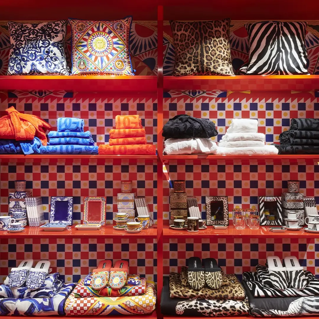 La tienda entera es un homenaje a la Navidad y la decoración navideña con su imponente color rojo como protagonista de toda la decoración, una decoración protagonizada por los objetos que proponen como regalo; se trata de objetos que van desde vinos de Donnafugata, dulces Fiasconaro y pasta de Pastificio di Martino hasta las clásicas sneakers Dolce & Gabbana, bolsos, gorras, cinturones, gorros de invierno, camisetas recién estampadas, mochilas, zapatillas para estar en casa, cojines, marcos de fotos, juegos de café, mantas de sofá, mochilas, carteras, bolsos de mano…