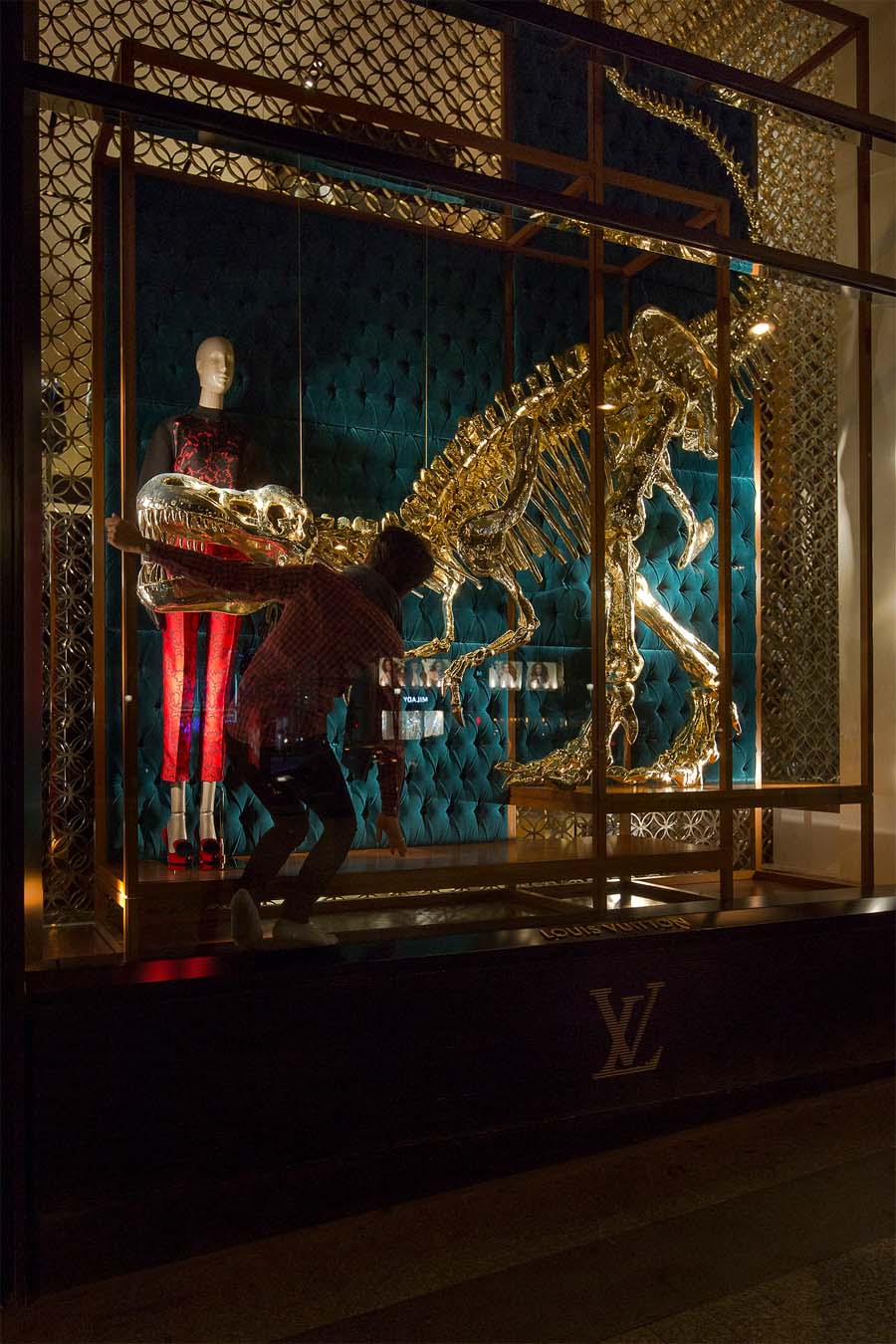 En esta ocasión, una simple visita a Les Jardin des Plantes ha hecho regresar a los dinosaurios de la era Mesozoica a la Maison a través de una fantasía ósea en colores dorados colocados en cabinas, hechas de roble, recubiertas de terciopelo verde oca. Un entorno que interactúa con pleno siglo XXI y mujeres que visten la colección prefall 2013 con algunos de los bolsos icónicos de Vuitton, como son Speedy, Alma o Noé.