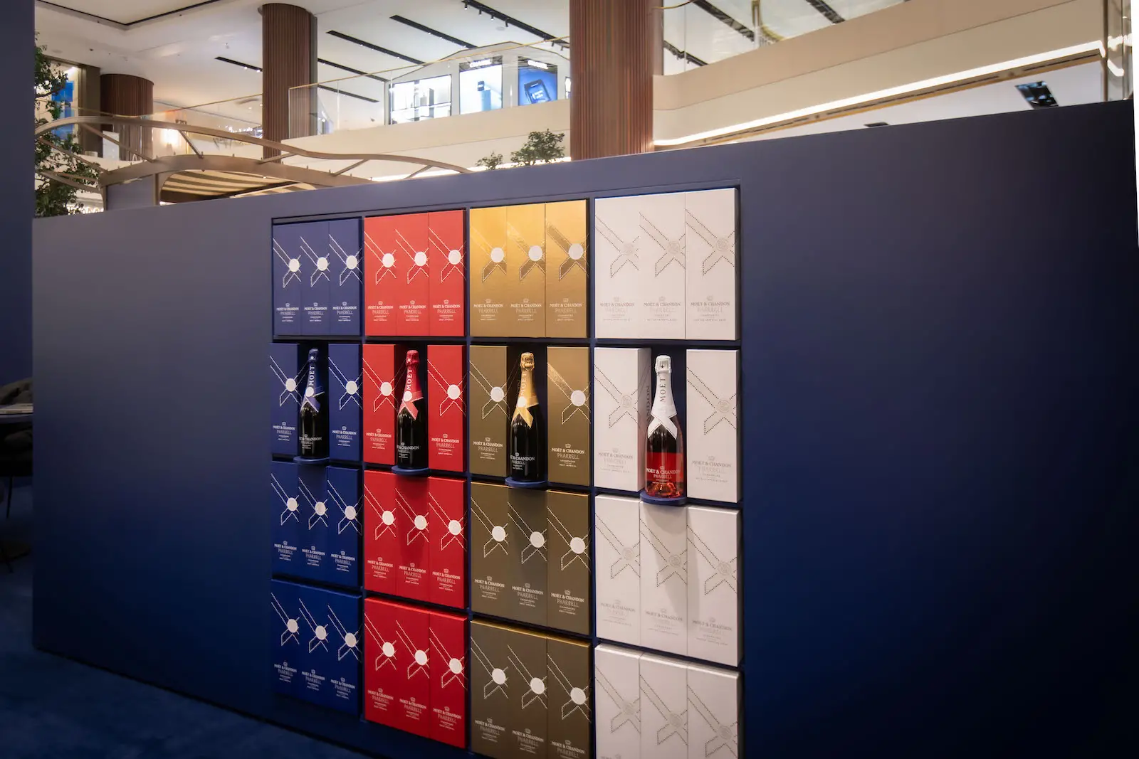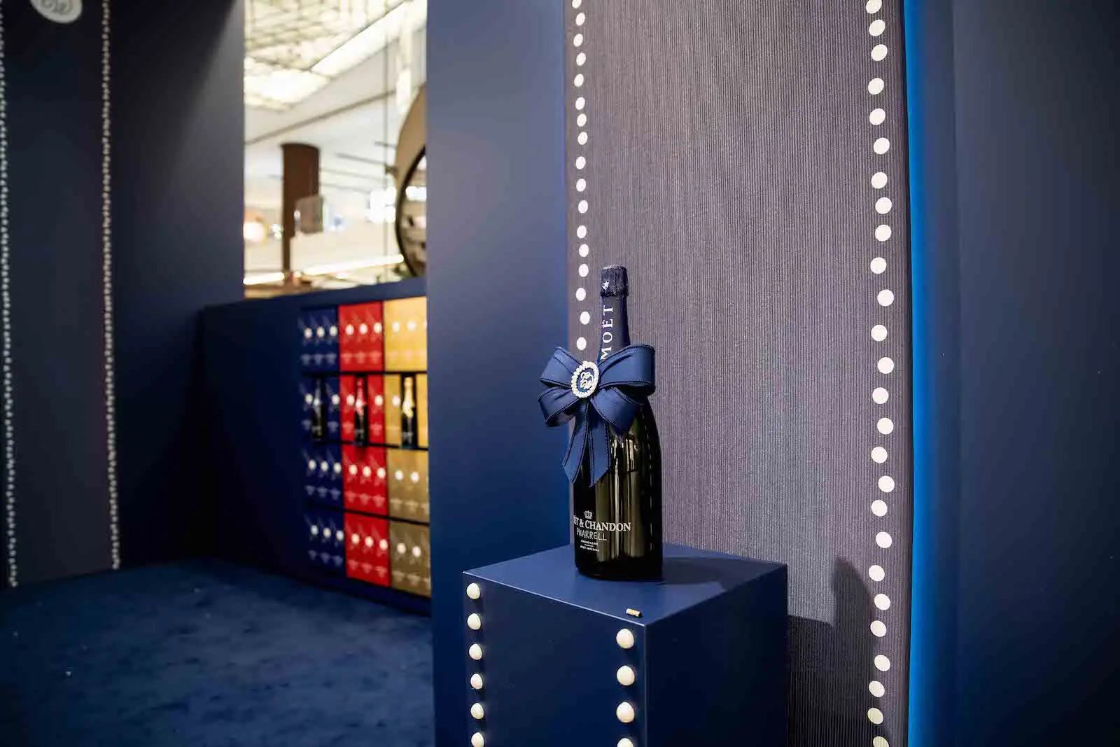 ¿Qué puedes esperar de esta pop up de Moët & Chandon en la Galería Canalejas? En esta tienda efímera, además de exponer las botellas diseñadas por Pharrell Williams en el marco de su colaboración con la firma francesa, ofrecen un servicio de empaquetado con lazos de colores e interesantes opciones de personalización: se puede personalizar tanto la botella como el lazo con las iniciales de la persona a la que se la quieras regalar.