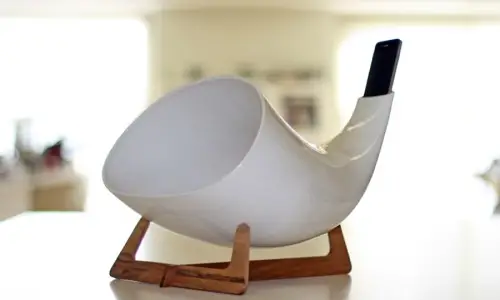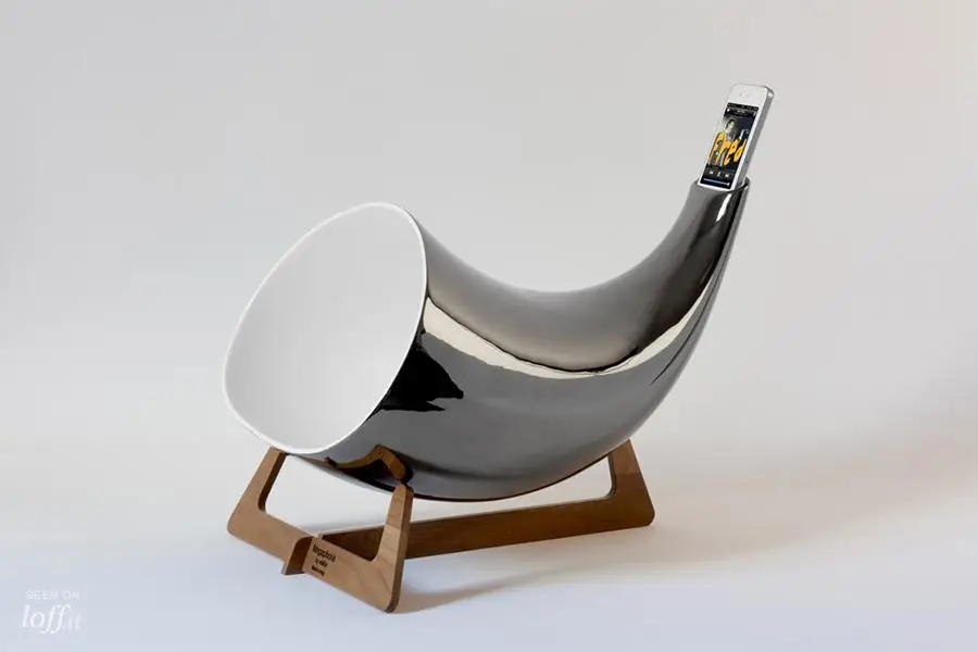 Sobre una delicada superficie de madera realizada a mano emerge una estructura de cerámica con forma de cuerno vikingo, diseñada para aumentar la magnitud del sonido y optimizarlo una vez que sale de nuestro iPhone (2G, 3G/3GS, 4/4S, 5/5C/5S, iPhone Touch). Su instalación automática convierte al Megaphone de En&is Design en un intuitivo dispositivo, perfecto para los amantes de la buena música, esos que saben apreciar la vibración del sonido y esperan con ansias la vuelta a casa para sentarse en su sillón, cerrar los ojos y sencillamente escuchar.