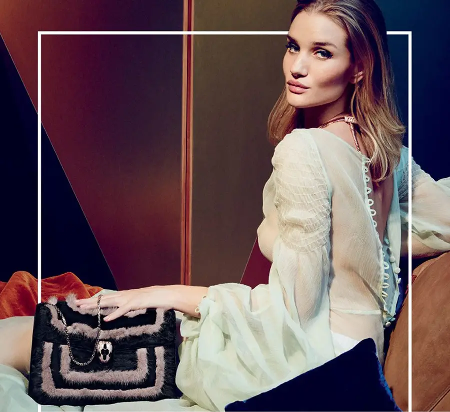 La modelo británica Rosie Huntington-Whiteley ha sido fotografiada por Michael Avendon para la presentación de una colección de bolsos y accesorios que se pueden llevar de la mañana a la noche. La colección Serpenti incluye accesorios de herrajes de oro y un tratamiento de la piel repujado con una apariencia de serpiente.
