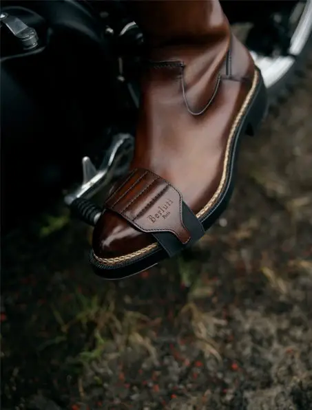 Los bolsos y carteras se cortan en cuero acolchado como el de las míticas chaquetas biker, en marrón y también en negro, son complementos a mano y en una sola pieza, ocho modelos que además de las clásicas carteras y una bolsa con un compartimento especial para el portátil, cuentan con las olvidadas ‘riñoneras’ un tipo de bolso la mar de práctico para montar en moto; las botas son otro de los complementos imperdibles de esta colección aunque, si eres no sólo amante de las motos sino también usuario habitual de este medio de transporte, el complemento que te conquistará será el casco, un casco de moto en piel y Berluti que es todo belleza, elegancia y estilo.