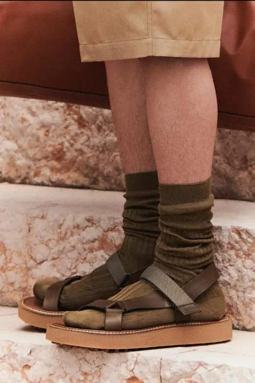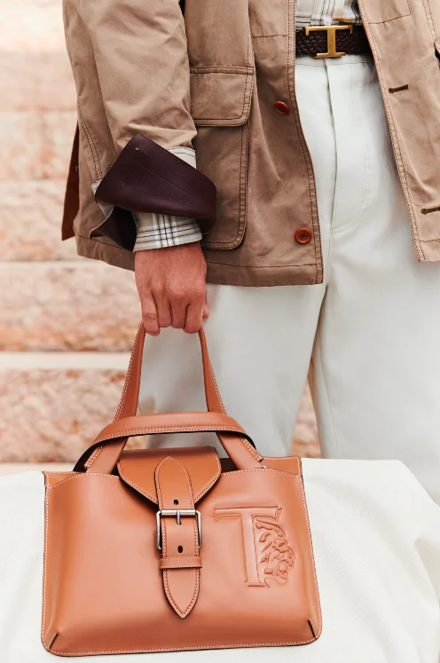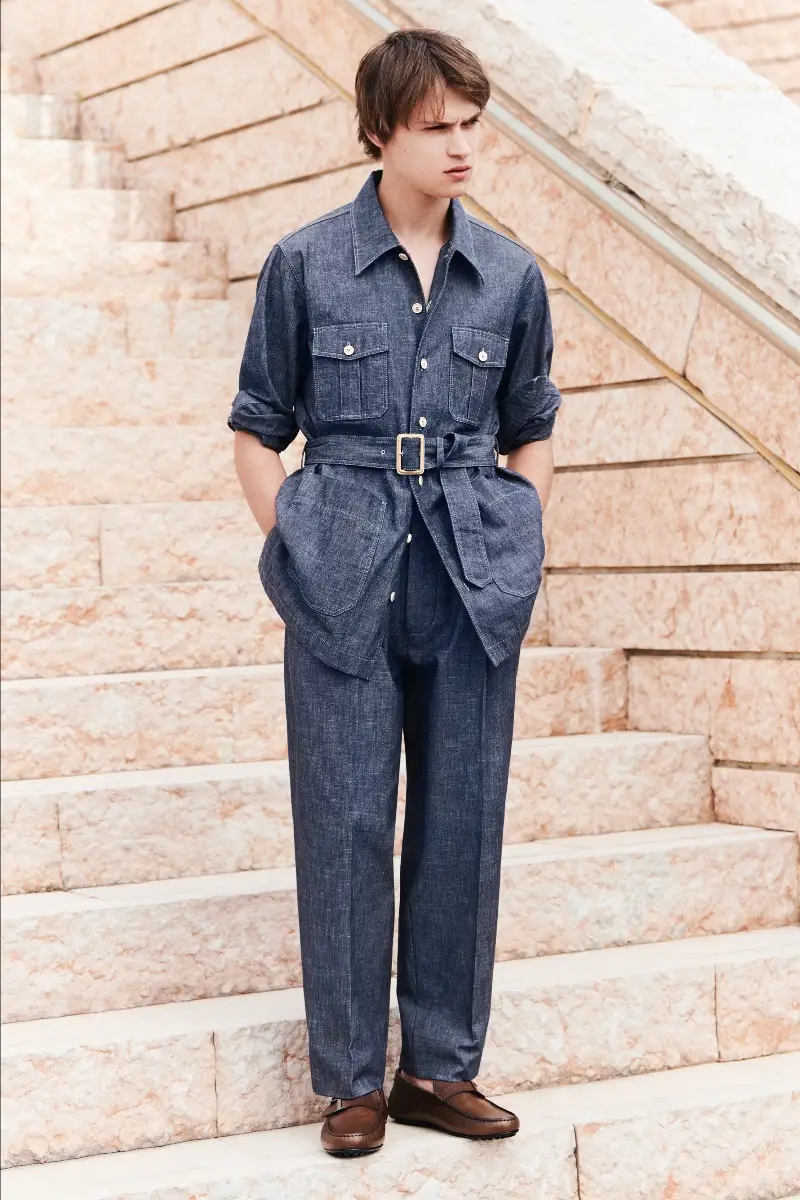 Esta colección parece pensada más para el tiempo libre que para el de trabajo por su paleta de color mediterránea, su estilo de safari urbano, imaginería aventurera y volúmenes suaves incluso en la sastrería: chaquetas Jack Biker de lona con coderas de piel con gomminos, sudaderas con capucha, la icónica T Jacket con bolsillos parche en contraste con cuero, gabardinas de nylon ligero y tonos brillantes, camisas de lona, bermudas, pantalones de chambray, otros con cordón ajustable en el tobillo, prendas de abrigo ligeras y accesorios espectaculares: suelas gruesas en los botines desert y Chelsea, el icónico modelo Winter Gommino totalmente renovado, sandalisa con suela de goma, las sneakers Dot Run en nylon y piel, mocasines T Timeless con nuevas formas, los Camera Bags decorados con la T de Tods’s y la silueta del león, bolsos de fin de semana, bolsos de rafia tejida y piel o de lona…