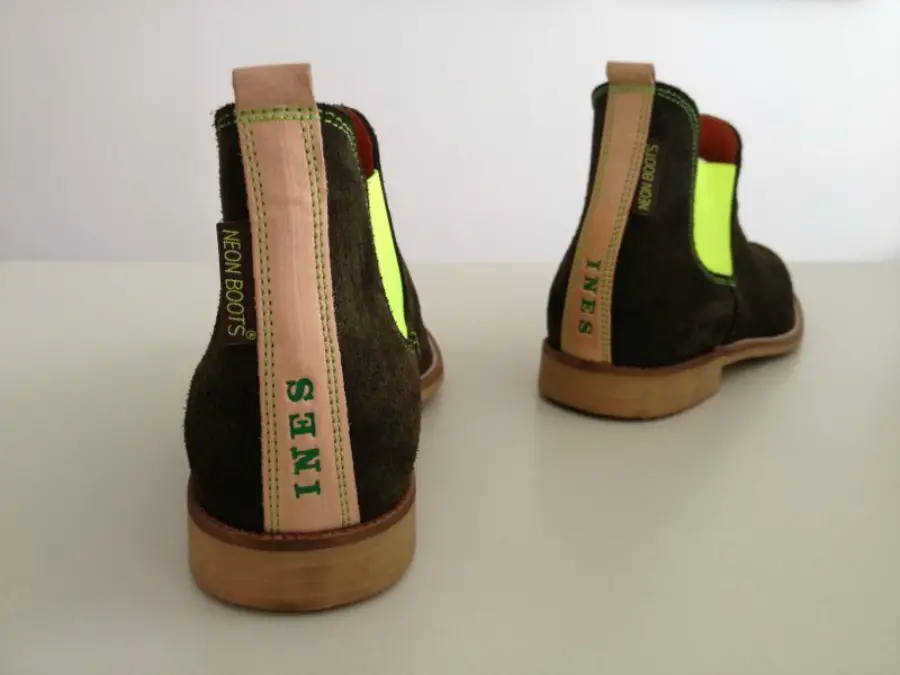 Con suela de crepe cosida a mano y banda elástica en colores flúor, los nuevos Chelsea diseñados por Neon Boots son perfectos también para los meses más cálidos, pues la piel de ciervo que recubre el interior del botín es transpirable aislando el pie del frío y del calor. Tanto ésta como el serraje exterior han sido cuidadosamente seleccionados cumpliendo con los más estrictos estándares de calidad. Si escoger entre la amplia variedad de colores y modelos –más de sesenta y cinco combinaciones– es toda una aventura, la diversión se multiplica con la posibilidad de personalizar las botas con tu mensaje, tu nombre o tu frase favorita grabados en la tira pespunteada que adorna la parte trasera del botín.