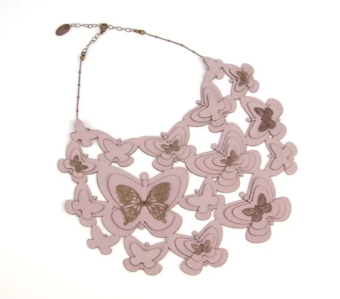 Románticas guirnaldas de mariposas rosas y diferentes tamaños se reúnen en torno al espectacular collar babero de Paca Peca, salvo esa rebelde que ha volado hasta una diadema del mismo color y textura. En los tocados de Monic mezclan sus alas con perlas, bordados y piedras preciosas obteniendo un resultado elegante y sofisticado. El toque naïf e inocente se dibuja en el vestido azul de Titis Clothing… ¿Y los bolsos? Seguro que en ellos se esconden sus más íntimos secretos.