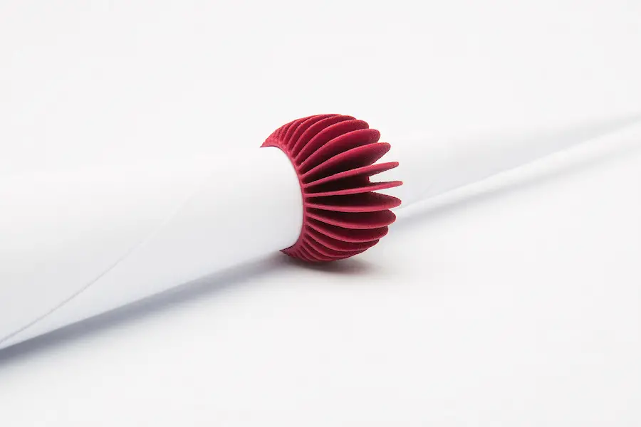 Curvas redondeadas y rectas orgullosas las de los anillos «Ray» que se inspiran en las esculturas de papel de Uros Mihic, el artista que convierte un cuadrado de papel con algunos dobleces en partes de una secuencia de luces, sombras y espacios moldeados con una precisión extrema.