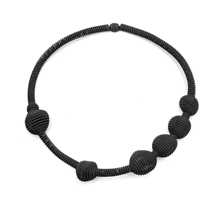 De las rectas al infinito juego de líneas de los collares «Spirale». Un ejercicio artístico en donde los espirales y remolinos de la línea son una danza infinita de arabescos que se entrecruzan interminablemente.