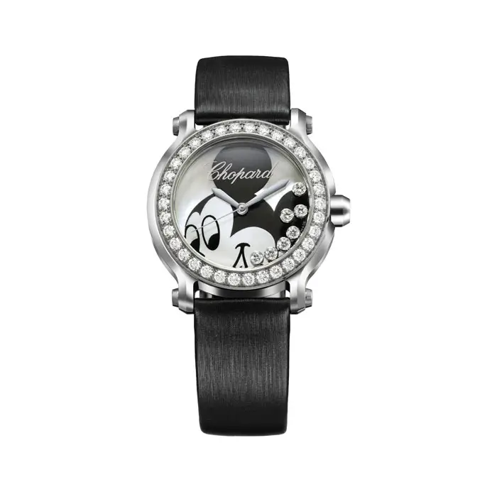 Dicen los de Chopard que comparten con el ratón «la misma alegría de vivir, el mismo dinamismo y el mismo espíritu de independencia». Y así ha nacido en oro blanco o rosa, la colección Happy Mickey: collares largos, colgantes, gargantillas, brazaletes, pendientes y relojes: los Happy Sport. En cada pieza han destacado «su amplia sonrisa, sus brillantes ojos o sencillamente sus redondas orejas, únicas y fáciles de reconocer».
