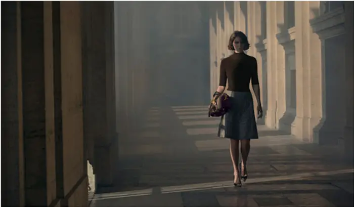 ¿Y ahora? ahora Louis Vuitton tiene una historia que contarnos… y esa historia empieza en los complementos que luce ella en su huída del Louvre: una nueva, elegante y sofisticada versión del icónico bolso Speedy Bandoulière; un brazalete de metal dorado con el clásico cierre Vuitton; un intrincado y floral anillo de oro y los zapatos, salones clásicos y en piel con un inequívoco detalle de la casa sobre el talón: un candado.