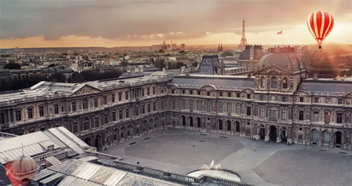 Llega al baúl y, sin perder un segundo, sabiendo a su perseguidor tras los pasos de su secreto, lo abre, toma un sobre y de nuevo su Vuitton de mano para lanzar sus pasos hacia la salida… una huída idílica, triufante y perfecta porque lleva consigo su tesoro y se eleva sobre el Cour Carrée hacia el cielo de París como se elevó Louis Vuitton como maestro maletero e ideal compañero de viajes con el apoyo de la Emperatriz Eugenia.