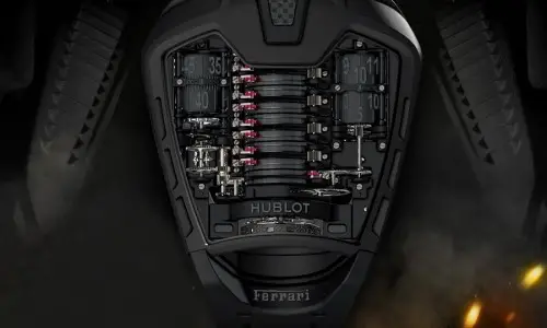 Hublot creó la primera versión de este reloj en 2013 para que sus clientes pudieran lucir un Ferrari en su muñeca porque es la versión más fiel posible que se podía conseguir del superdeportivo LaFerrari de la casa del cavallino rampante, un híbrido con 963 caballos de potencia. Con él Hublot aumentó la marcha del reloj a unos límites insospechados: 50 días. La última novedad de la gama es este reloj, el MP-05 La Ferrari All Black.