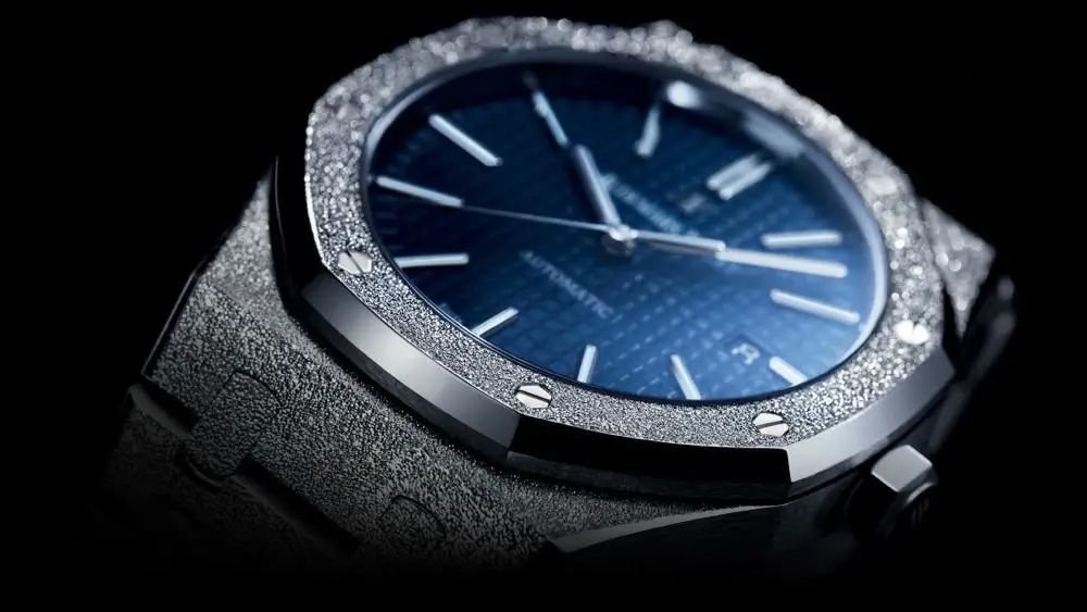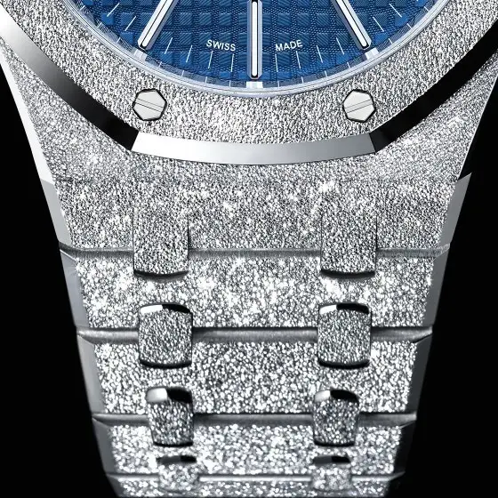 El Audemars Piguet Royal Oak Frosted Gold original se ofrecía tanto en oro blanco como en oro rosa o amarillo, su caja era además de 33 o 37 mm mientras esta nueva edición limitada a 200 piezas incrementa el tamaño y reduce la variedad: sólo se presenta en oro blanco y caja de 41 mm.