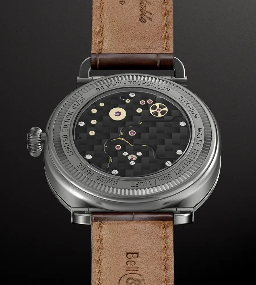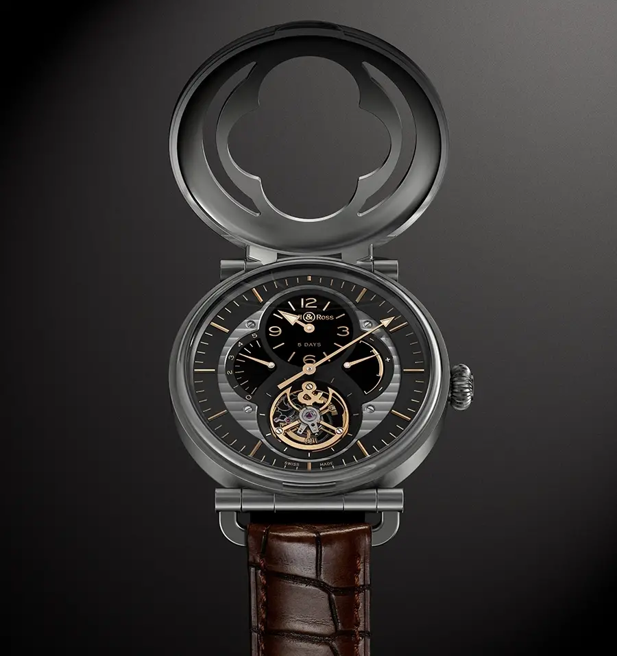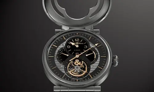 La Primera Guerra Mundial cambió el mundo en muchos sentidos, incluso cambió el campo de batalla. Se estrenaron los primeros aviones de combate y los carros blindados y los relojes militares tuvieron que proteger su frágil cristal mineral con una coraza para evitar que se rompiera durante los combates aéreos y terrestres. Bell & Ross rescata la armadura de antaño en su Vintage WW2 Military Tourbillon, pero lo hace no para proteger el cristal, que no es mineral sino de zafiro que es sólido y resistente, sino para reforzar el diseño y “contener las complejidades”. Otra diferencia es que mientras las rejillas de los relojes militares que combatieron en la contienda bélica dificultaban la legibilidad y la lectura de las horas, la opción de Bell & Ross no es ningún problema pues arropa todas las indicaciones con sus formas curvas y con ella aumenta su legibilidad pues la mirada se concentra en lo esencial: la lectura de las horas, minutos, indicador de reserva de marcha y de precisión, así como la admiración del tourbillon. Si se abre el protector mediante la bisagra, su esfera se revela al completo.