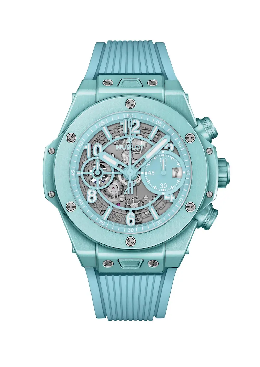 Caja de 42 mm en alumino anodizado en tono turquesa satinado y pulido, un reloj producido en edición limitada, tan limitada que solo se distribuirán 200 y lo harán, en primicia, en las boutiques Hublot que están situadas junto a las aguas del Mediterráneo famosas por su color turquesa: Capri, Mykonos, Cannes, Saint Tropez, Forte dei Marmi e ¡Ibiza!.