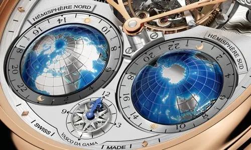 Los relojeros de Montblanc logran sus propias epopeyas pues exploran territorios relojeros complejos con un formato poco convencional. El puente de Montblanc entre los dos hemisferios y entre la tradición y la modernidad tiene forma de reloj. Pero no de un reloj cualquiera. El Villeret Tourbillon Cylindrique Geosphères Vasco de Gama se presenta con caja de oro rosa de 18 quilates de 47 mm y esfera tridimensional, también de oro. El dial está dividido en varios segmentos. Hay muchos elementos que establecen nexos de unión entre Vasco de Gama y el reloj estrella del 2015 de Montblanc. La parte superior está decorada con un guilloché ondulado, una alusión clara a los océanos y a la aventura marinera del descubridor. Sobre este decorado, el tourbillon con espiral cilíndrica desafía a la fuerza de la gravedad. La parte inferior presenta decoración graneada y en ella el protagonismo lo comparten los mapas de los dos hemisferios y la rosa de los vientos, utilizada esta última para mostrar con su aguja con forma de “Flor de Lis” la hora en un segundo huso horario, la del lugar de origen. Los continentes de los dos mapas están grabados y los océanos han sido pintados a mano. Tienen detalladas las líneas de la latitud y la longitud e ilustran el paso de los días y las noches en el Hemisferio Norte y Sur. Los mapas no se mueven, son los dos discos indicadores de los 24 husos horarios los que giran una vez por día a su alrededor. El del Hemisferio Norte lo hace en sentido de las agujas y el del Hemisferio Sur gira en sentido contrario.