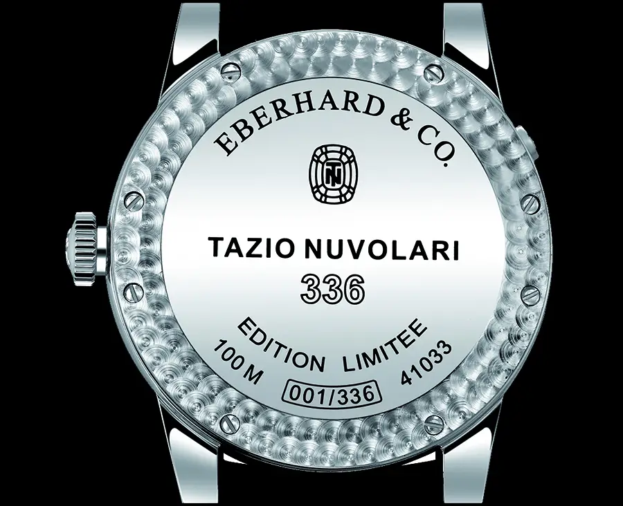 Este reloj, producido en una edición limitada de 336 piezas, está dedicado a una de las leyendas del motor, el piloto Tazio Nuvolari. Y los guiños que hace Eberard & Co al piloto, que batió el récord de velocidad el 15 de junio de 1935 en la carretera Firenze-Mare con un Alfa Romeo 16 C de doble motor diseñado por Enzo Ferrari, saltan a la vista en la esfera pues lleva su firma en rojo, el simbólico número 336 y sus iniciales “TN” en el caparazón de la tortuga, emblema también de Tazio Nuvolari. También lleva las iniciales del piloto el pulsador alargado de las 10 horas con el que se regula la función del doble huso horario. El homenaje culmina en el fondo donde además se deja constancia de que es un reloj en edición limitada.
