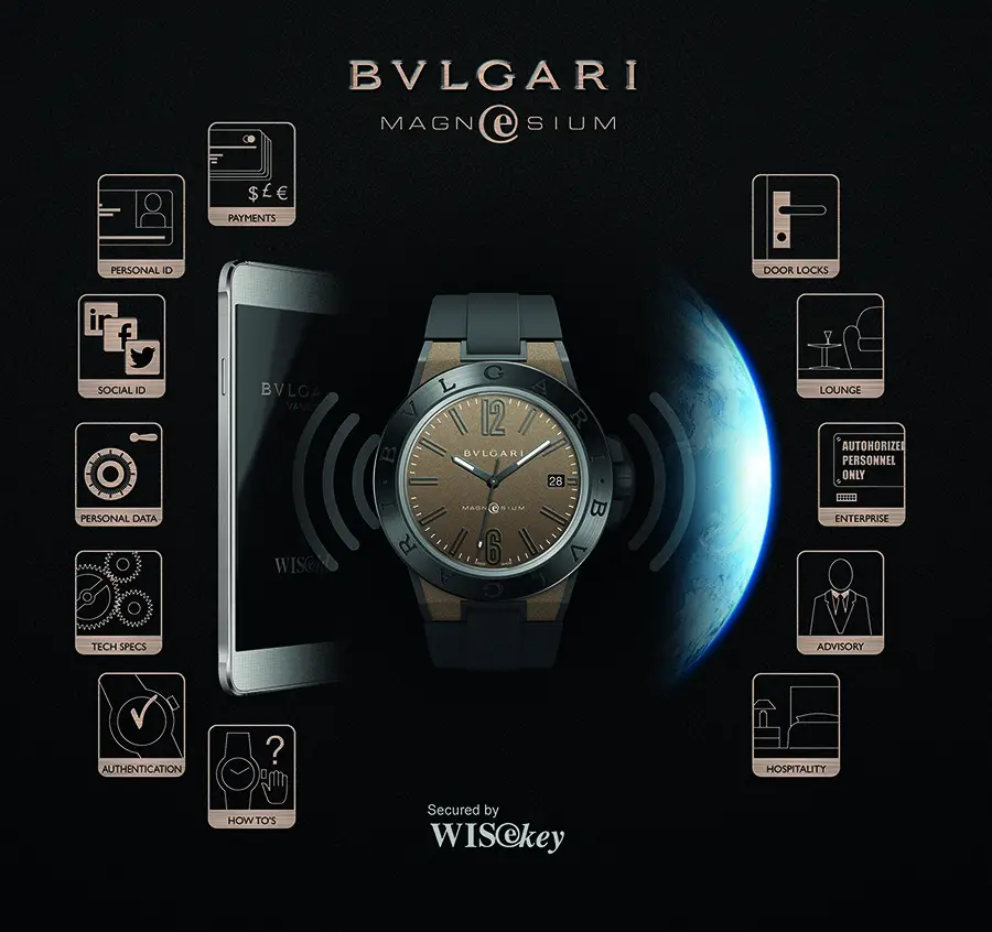 Bulgari ha presentado en Basilea 2015 su reloj Diagono Magnesium Concept Watch con el lema “100 % suizo, 100 % seguridad, 100 % lujo, 0 % gadget” y el elemento diferenciador es su pasaporte electrónico que garantiza la seguridad total de la información personal de su propietario.
