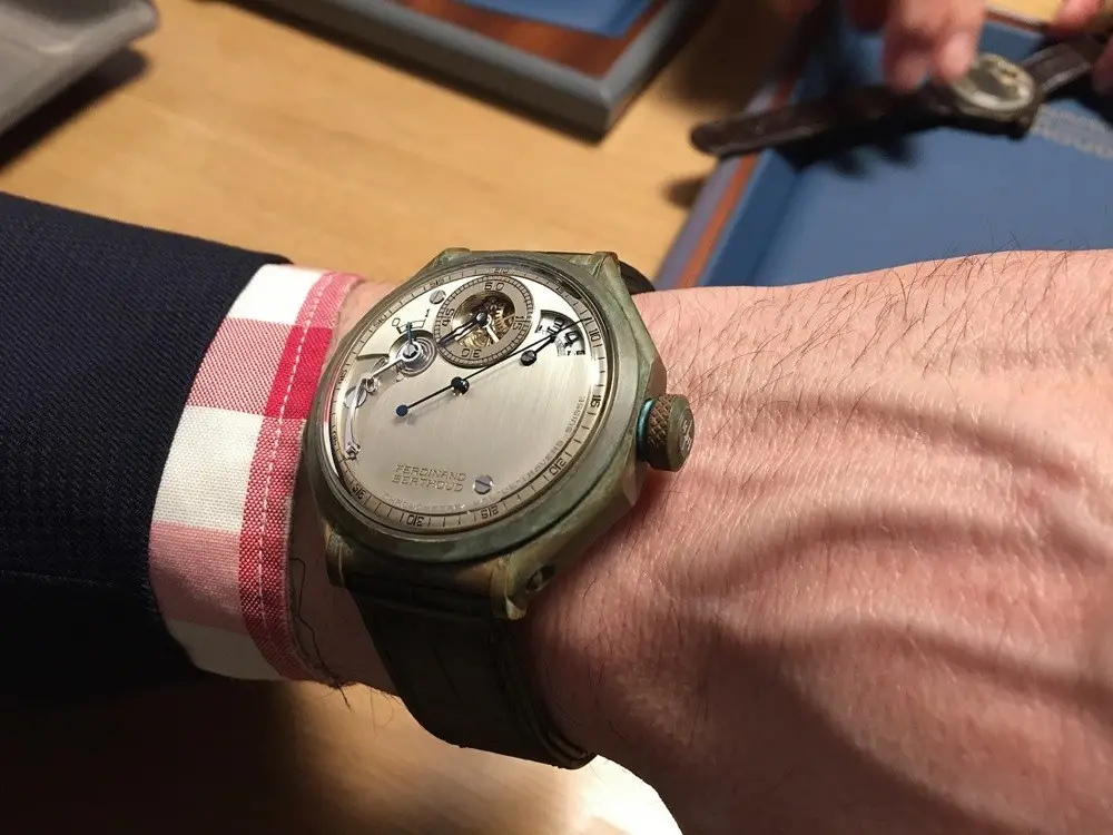 Su aspecto resulta impresionante, y realmente parece que estamos ante unos relojes que hayan sufrido las inclemencias del paso del tiempo y de una vida marítima a través de los océanos. Simplemente, una maravilla. La caja está adornada con dos asas laterales de bronce, que le aportan su característica forma octogonal. Los flancos están perforados con dos ojos de buey laterales, a las 2h y a las 11h, que permiten admirar el funcionamiento del mecanismo de huso-cadena, aunque la mejor panorámica del calibre FB-T.FC.R-2 la obtenemos desde la trasera gracias a su fondo de zafiro. Sus 53 horas de reserva de marcha se remontan manualmente a través de la corona de bronce, moleteada y provista de un medallón de titanio. Cuando cargamos el muelle mediante el sistema huso-cadena, no podemos sino disfrutar de la música que emite, un sonoro clec-clec-clec que es pura delicia.