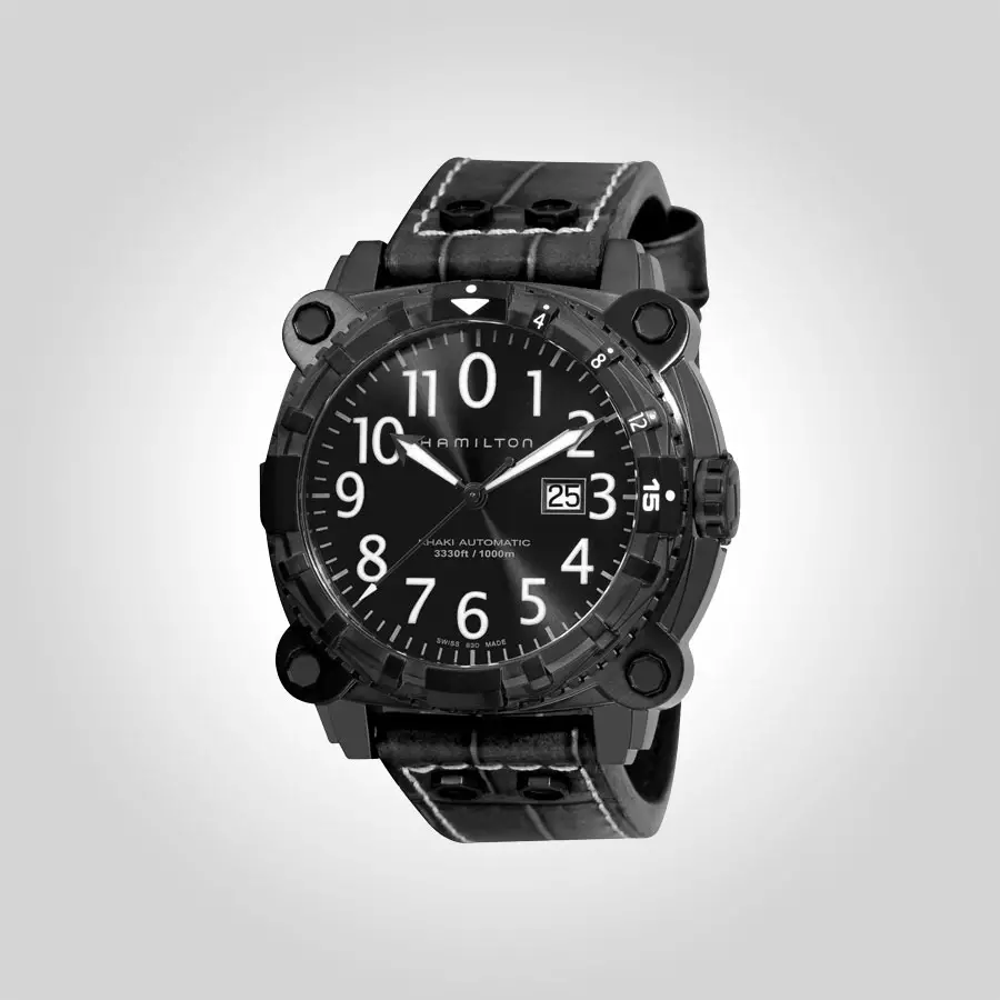 La caja octogonal y el cristal de zafiro convexo de 4,5mm de grosor del Hamilton Belowzero parecen creados para desafiar a las criaturas marinas que habitan las profundidades donde la oscuridad es permanente. El reloj incorpora una válvula de helio pensada para evitar que este gas al expandinser durante el tiempo de descompresión dañe el reloj.