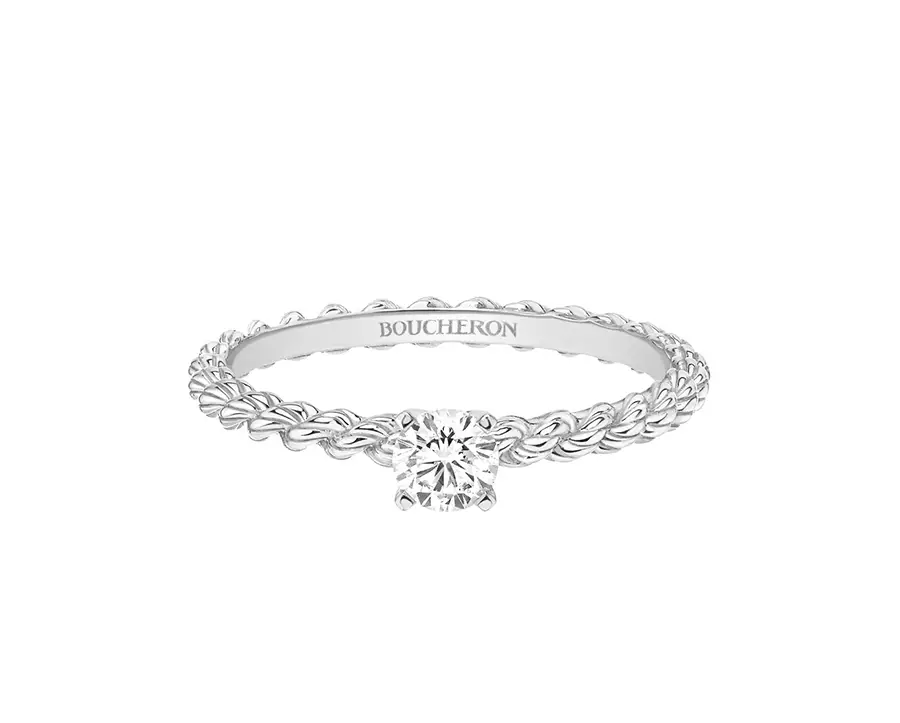 También Serpent Bohème se reinventa para momentos tan importantes en la vida de una mujer como el día de su pedida de mano o el día de la boda. Las propuestas de Boucheron en su línea Serpent Bohème nupcial son más delicadas y femeninas. Los anillos de compromiso y las alianzas se enrollan alrededor de los dedos con la calidez del oro blanco y amarillo y, por primera vez, en oro rosa. En los solitarios, el diamante se mimetiza con el áureo metal trenzado.