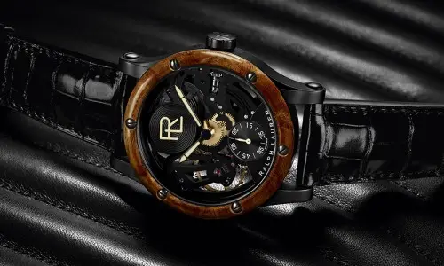 Este reloj está equipado con el primer mecanismo Ralph Lauren que queda completamente al descubierto. Es de carga manual y lo ha fabricado IWC para la firma americana. No hay esfera para que se aprecia la profundidad del movimiento que se ha acentuado con el acabado ennegrecido de la platina y puentes y el dorado de las ruedas. Sobre el barrilete, ubicado a las 12 horas, vemos las iniciales de la marca, y a las 6 horas, en perfecta simetría, el segundero. El bisel es de madera de Amboyna con nudos muy finos y es en enlace que utiliza Ralph Lauren para conectar este reloj con el Bugatti porque con esta exclusiva madera se crean los interiores de los coches de lujo.