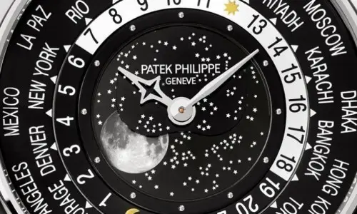 Tradicionalmente, los relojes con Hora Universal de Patek Philippe lucían en el centro de la esfera un motivo guilloché o un esmalte de línea cloisonné. Sin embargo, el World Time Moon no presenta ninguna de ambas, precisamente porque su lugar lo ocupa la imagen lunar. Lo que se mantiene es que la hora local aparece indicada por las agujas centrales y se corresponde a la del huso horario seleccionado a la altura de las 12.