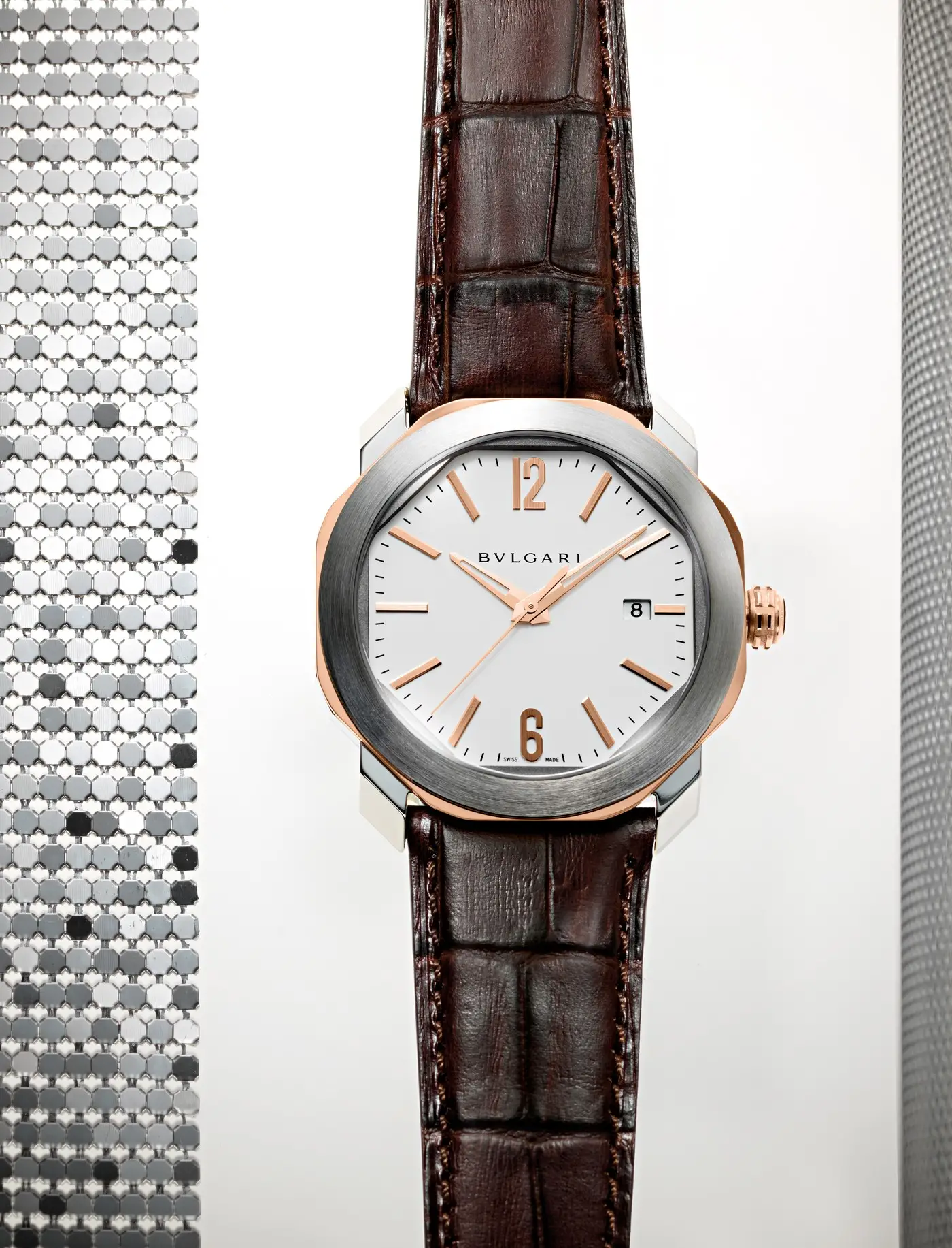 La forma del reloj Octo Roma de Bulgari, que se inspira en los motivos octogonales que decoran la o, se diseñó en la década de los 2000 para los modelos Grand Complication y fue evolucionando gradualmente hasta alcanzar en 2012 la versión de horas y minutos con el popular diseño, reinterpretado ahora con un enfoque que expande los límites de la pureza formal del octógono.