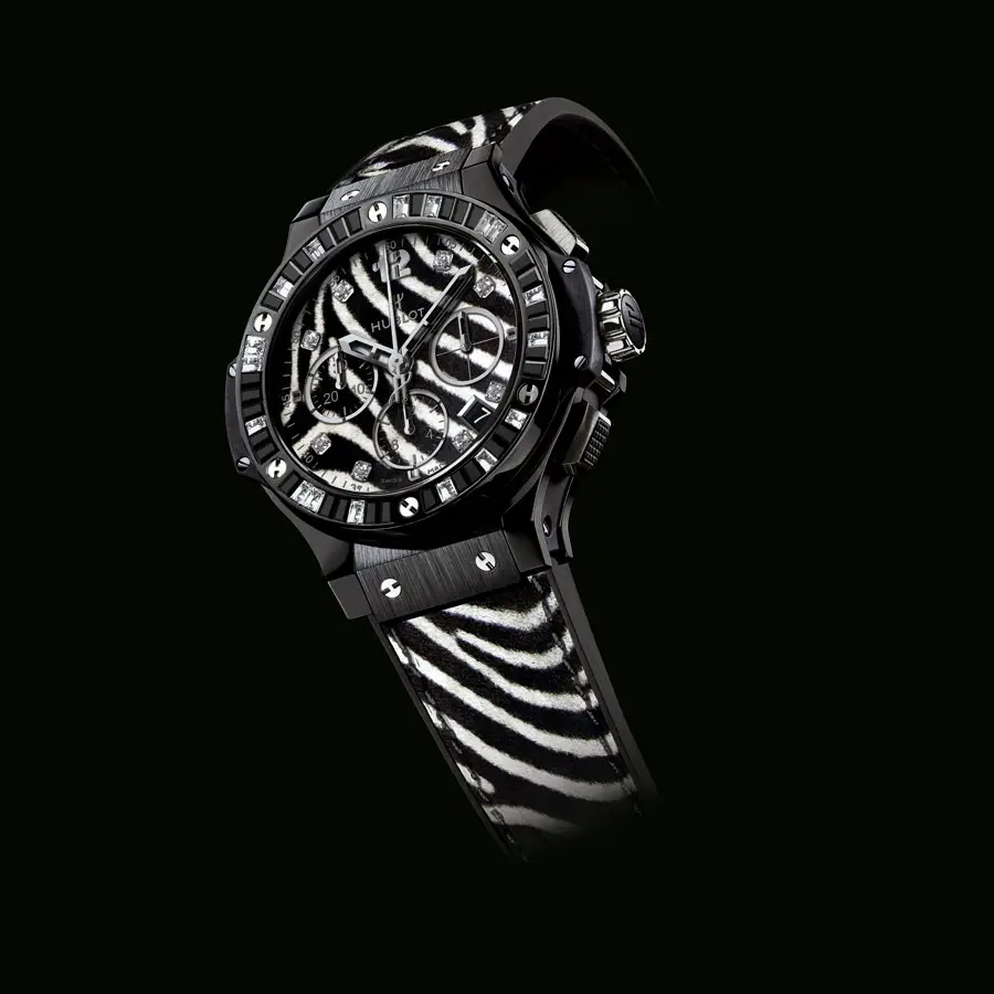 Si no te atreves, empieza por un detalle pequeño. Por ejemplo, por tu reloj. Este es el Big Bang Zebra Bang, una edición limitada a 250 piezas de cada una de las tres versiones: cerámica negra, cerámica blanca u oro rojo de 18 kilates. Hublot sigue atento a la llamada de la selva y lanza este modelo después de sus exitosos Leopard Bang y Boa Bang. Se trata de un reloj súper femenino compuesto por un bisel con 48 topacios, esfera con estampado de cebra de 41 mm de diámetro, movimiento cronógrafo mecánico automático y adornado con correa de piel de becerro con estampado de cebra cosida sobre caucho negro. Un reloj muy resultón con el que no pasarás inadvertida.