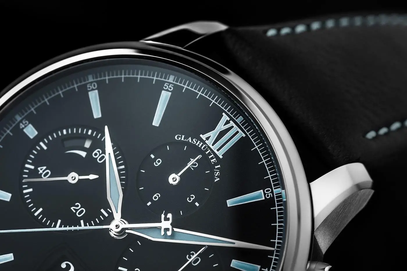 El nuevo Senator Chronograph Panorama Date de Glashütte Original destaca por muchas razones, pero lo que llama a simple vista la atención es su estilo y elegancia y el brillo y color de la cantidad de Super-LumiNova azul que ha empleado la marca para destacar sobre blanco, en su esfera de un intenso negro, las agujas, las números romanos y todos los índices.
