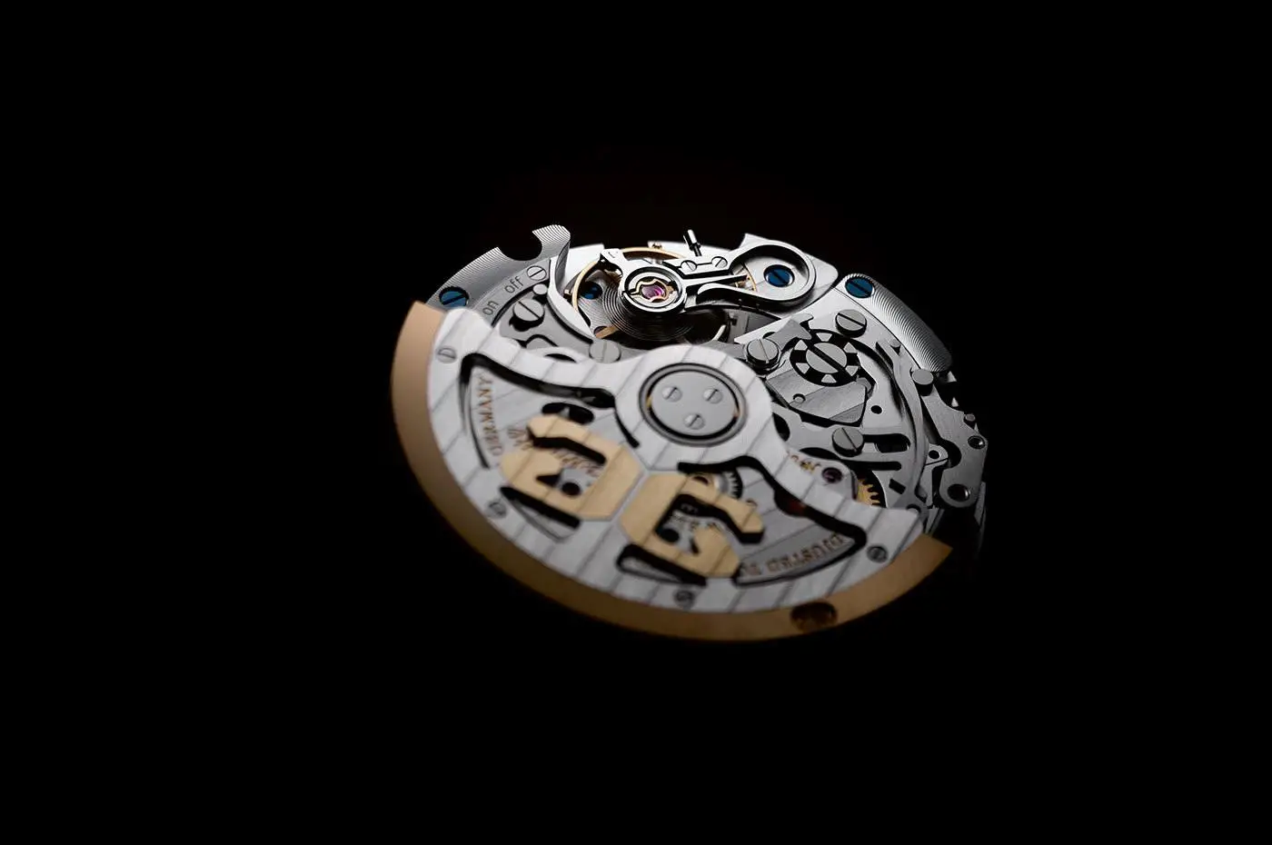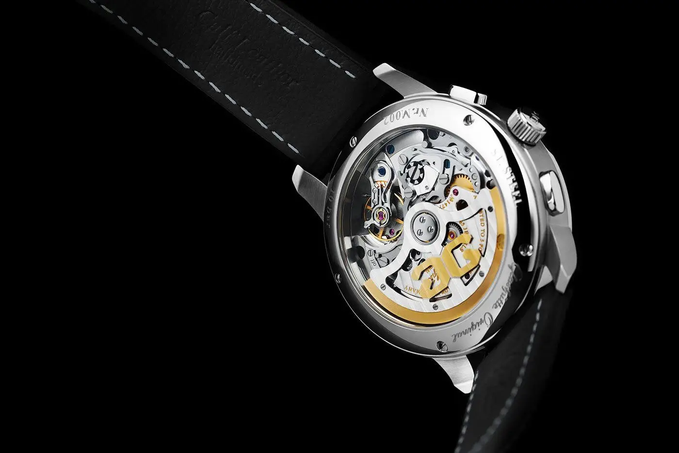 En una generosa e importante caja de acero inoxidable pulido de 42 mm -que ha aumentado su hermeticidad hasta los 10 bares con una corona enroscada- encontramos un mecanismo automático compacto, resistente, preciso y realmente fiable para el día a día. Cuenta con flyback y el cronógrafo que muestra las 12 horas a las 12, los minutos a las 3 y los segundos a las 9, así como el día del mes a las 6. Grandes complicaciones que se muestran del modo más sencillo posible.