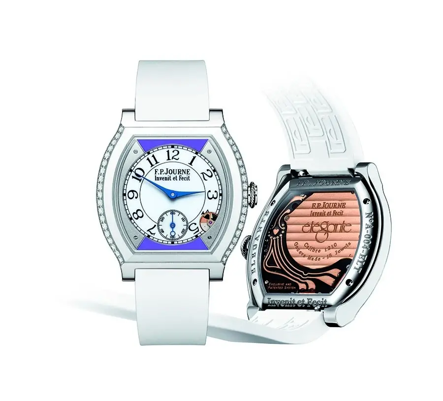 El modelo femenino con caja de titanio, diamantes y pulsera de caucho fue vendido por un precio de 55.000 francos suizos. La firma suiza F.P Journe creó las piezas únicas de los dos relojes subastados con los colores de la ONG Action Innocence en la esfera.