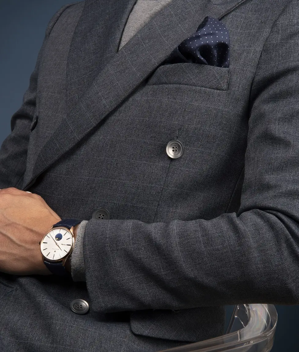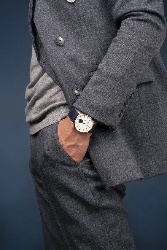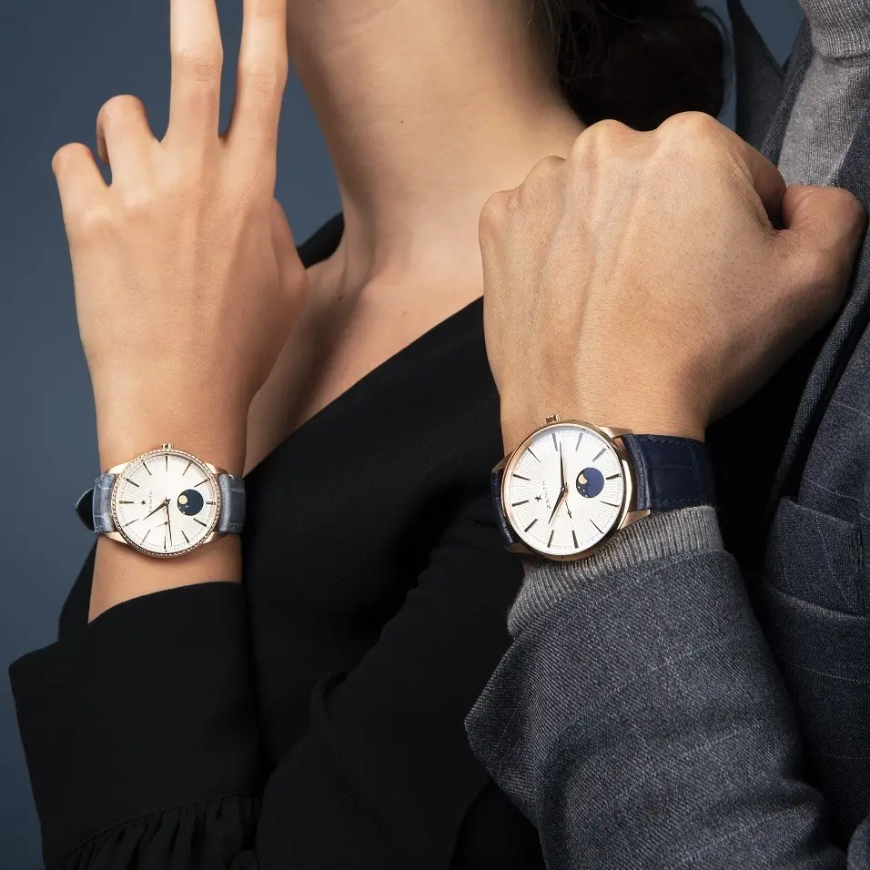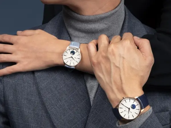 Este par de relojes Elite Moonphase son verdaderas joyas suizas, se presentan en versión de 40,5 mm y otra de 36 mm, ambas con un bisel engastado con diamantes (porque, como el amor, los diamantes son para siempre y ese es el tiempo que medirás con tu pareja en estos par de relojes, el tiempo que cabe en un ‘para siempre’); esfera de color blanco plateado, con los rayos del sol dándole un toque romántico junto a la luna, con un círculo azul medianoche en la mitad inferior del dial y regalándonos así una imagen que parece el más romántico de los cielos, uno en el que no faltan tampoco las estrellas doradas; el pequeño segundero que no cesa, ubicado en las 9, nos recuerda que por largos que se nos hagan algunos días, el tiempo es efímero y por más que ‘para siempre’ suene eterno, el tiempo que cabe en él es finito.
