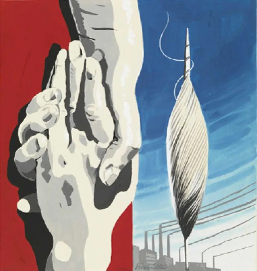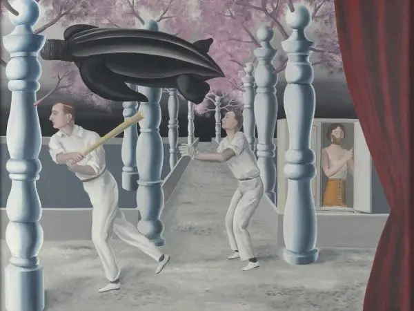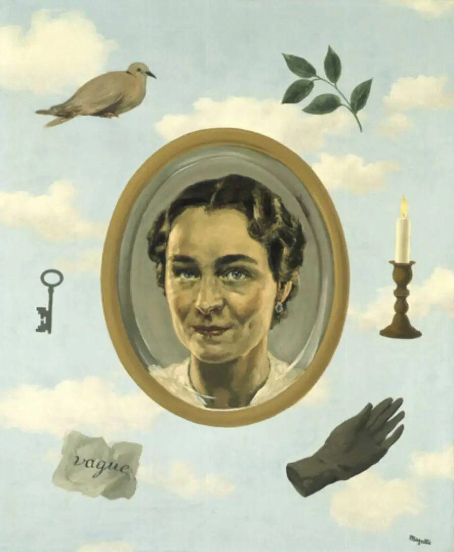 Es entonces cuando emergen en sus lienzos pipas, manzanas, bombines, paraguas y cielos celestes salpicados de nubes de algodón… Elementos perturbadores como los grelots (cascabeles), las perlas, las cabezas desfondadas, las miradas cubiertas, los rostros evaporados o los árboles invertidos surcan una obra más y más enigmática, repleta de simbolismos e ironía.