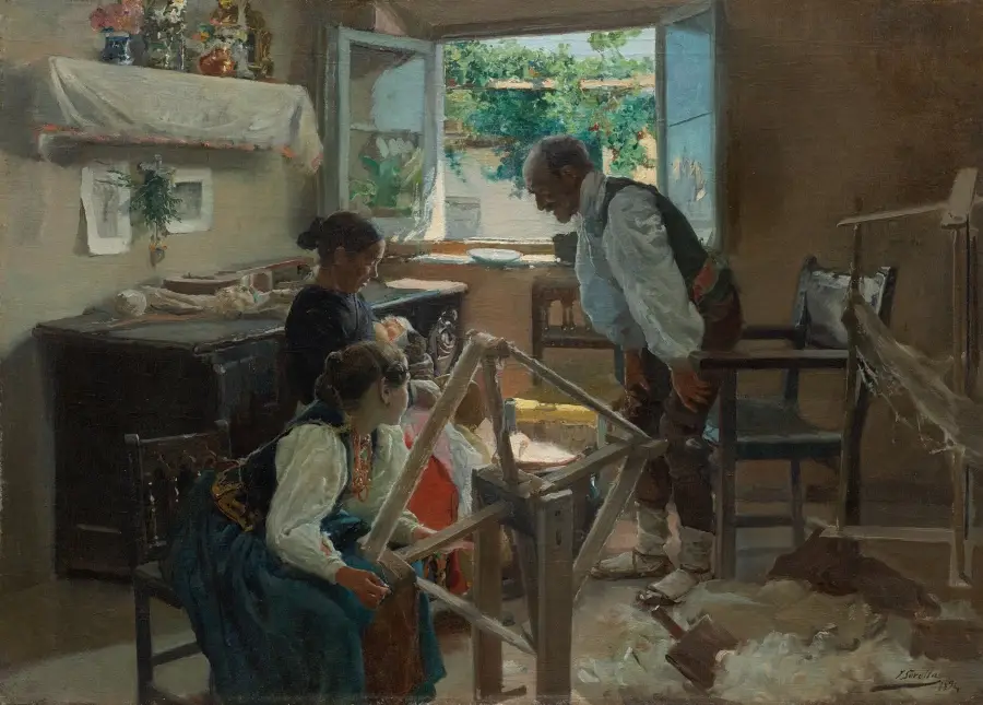 Pedro Masaveu también fijó su atención coleccionista en las escenas de género. Escenas muy heterogéneas que representan aldeanos de la zona rural del Lazio o de Campania, indagaciones sobre la luz como sucede en el precioso cuadro Familia segoviana (1894), las acuarelas o las vinculadas al mundo del trabajo, temático que comenzó a cultivar más intensamente a partir de 1900. A partir de 1912, los estudios de tipos y costumbres de las diferentes regiones españolas, en grandes formatos y pintados a plena luz del sol, ocuparían sus últimos años de pintor.