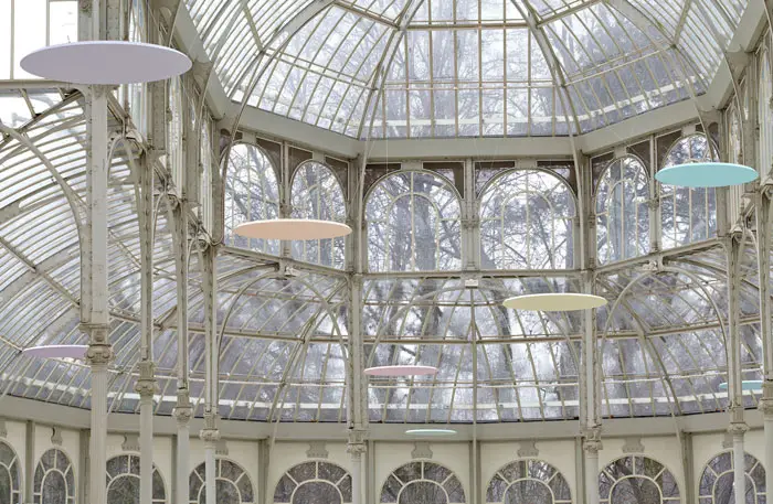 Pintadas cada una de un color suman un total de doce distintos con una luminosidad suave produciendo un efecto de bienestar y ligereza. La transparencia del espacio donde está instalada permite su cambio y transformación según los horarios y la incidencia del sol.