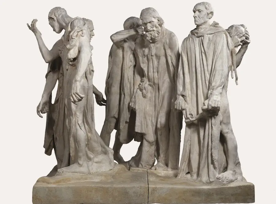 El recorrido comienza con el espléndido conjunto en yeso de Los burgueses de Calais, expuesto junto a varios grupos escultóricos de Giacometti: La Plaza, Cuatro mujeres sobre pedestal, El Claro. A partir de ahí y durante nueve secciones, estratégicamente diseñadas, vamos descubriendo toda la verdad, como si a cada paso se levantara un velo, un trozo de misterio. La materia y el modelado constituyen otro de los puntos de encuentro que, junto con la deformación de la figura, confieren a ambos una personalidad artística descomunal, inimitable. La forma, antagónica; la formulación, afín; el resultado, una visión nueva del lenguaje artístico.