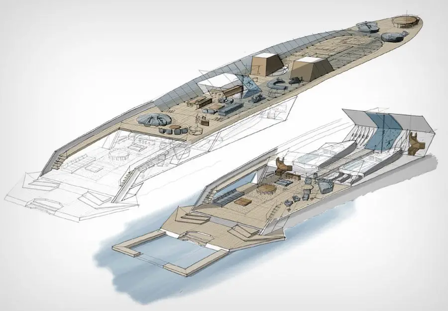 Una estructura sólida que permite construir con los materiales más ligeros -fibra de carbono, titanio- y una gran cantidad de desarrollos tan inteligentes como la propia concepción de este gran barco, incluida una pasarela modular que permite llegar a la playa andando o en uno de los vehículos que se pueden guardar en su garage, o el hecho de que se aprovechen tuberías y conductos como parte del diseño interior para prescindir del peso de revestimientos y panelados de decoración sin dejar de conseguir una decoración de lujo, confortable, elegante, moderna y totalmente funcional. Con todo, su peso final le permite fondear más cerca de la costa que a cualquier otro superyate de similares dimensiones.