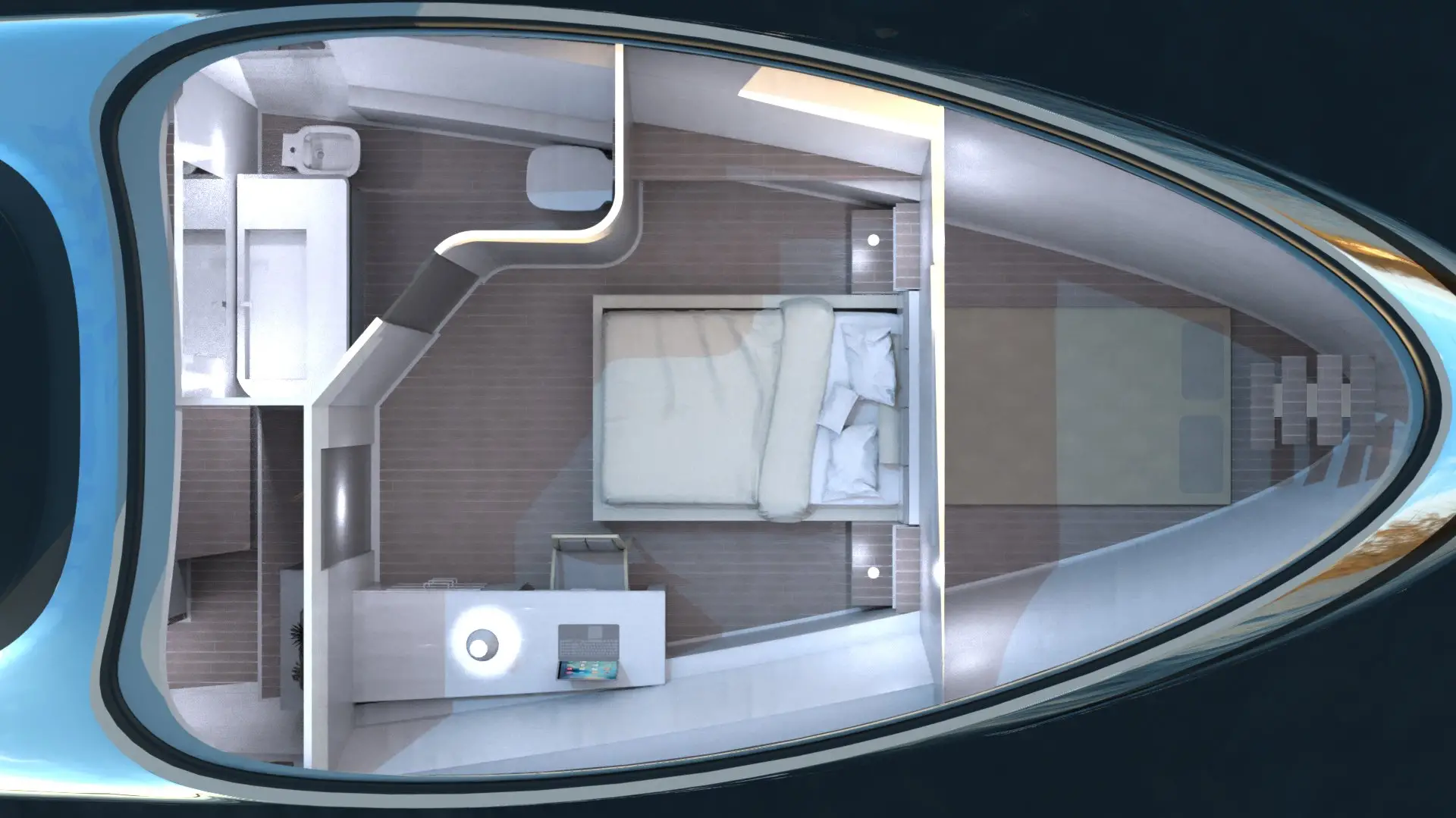 ¿Más detalles del Embryon Hyperboat Concept? 24 metros de eslora, espacio para que hasta 8 personas naveguen a placer y perfectamente acomodados en una suite principal, otra VIP y tres suites dobles y dos salones con terraza y plataforma de baño para 10 personas.