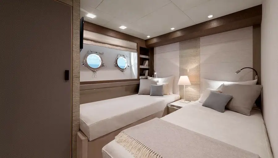 Una de los aspectos más llamativos del MCY 96 son las magníficas ventanas de suelo a techo tanto en el salón como en la suite del propietario; este tipo de pared, además de aligerar la estructura del yate, lo ilumina y le da una sensación de amplitud a sus espacios más íntimos.