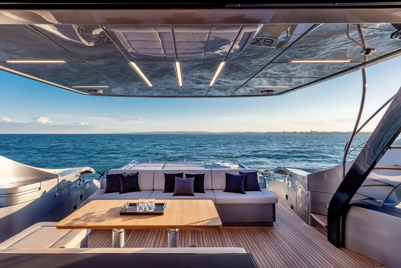 Claro que no es sólo velocidad lo que nos ofrece el Pershing 8x porque no es sólo un yate deportivo sino también una embarcación de lujo: cuenta con una plataforma de baño con acceso directo al garaje que es el lugar reservado para los juguetes náuticos, en el lateral del yate descubrimos la escalera que da acceso a la cubierta superior y que permite, por su novedosa ubicación, ganar espacio en la zona central del yate; la zona de proa se reserva como espacio de solarium y se amuebla con magníficas tumbonas y un amplísimo sofá.