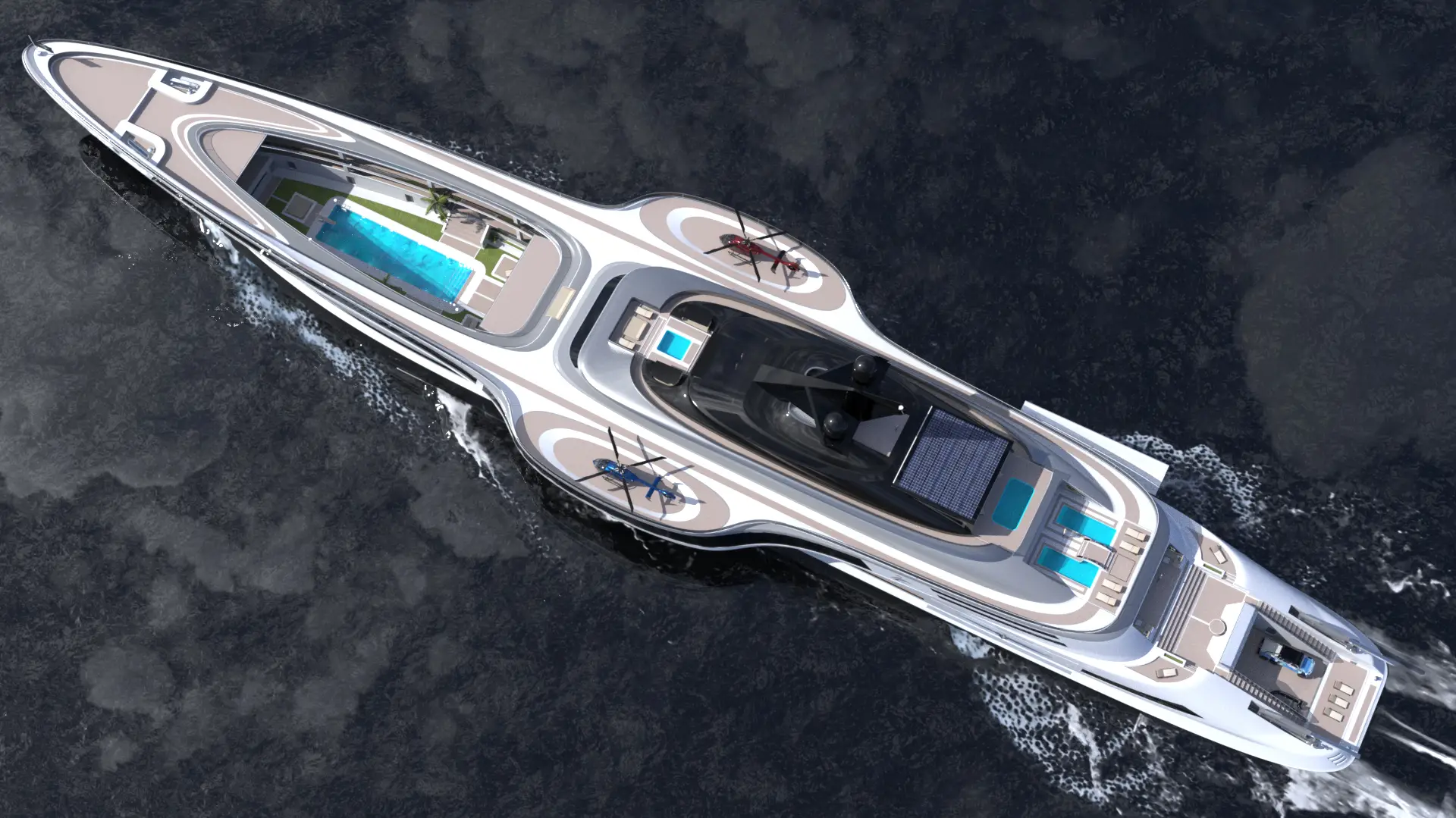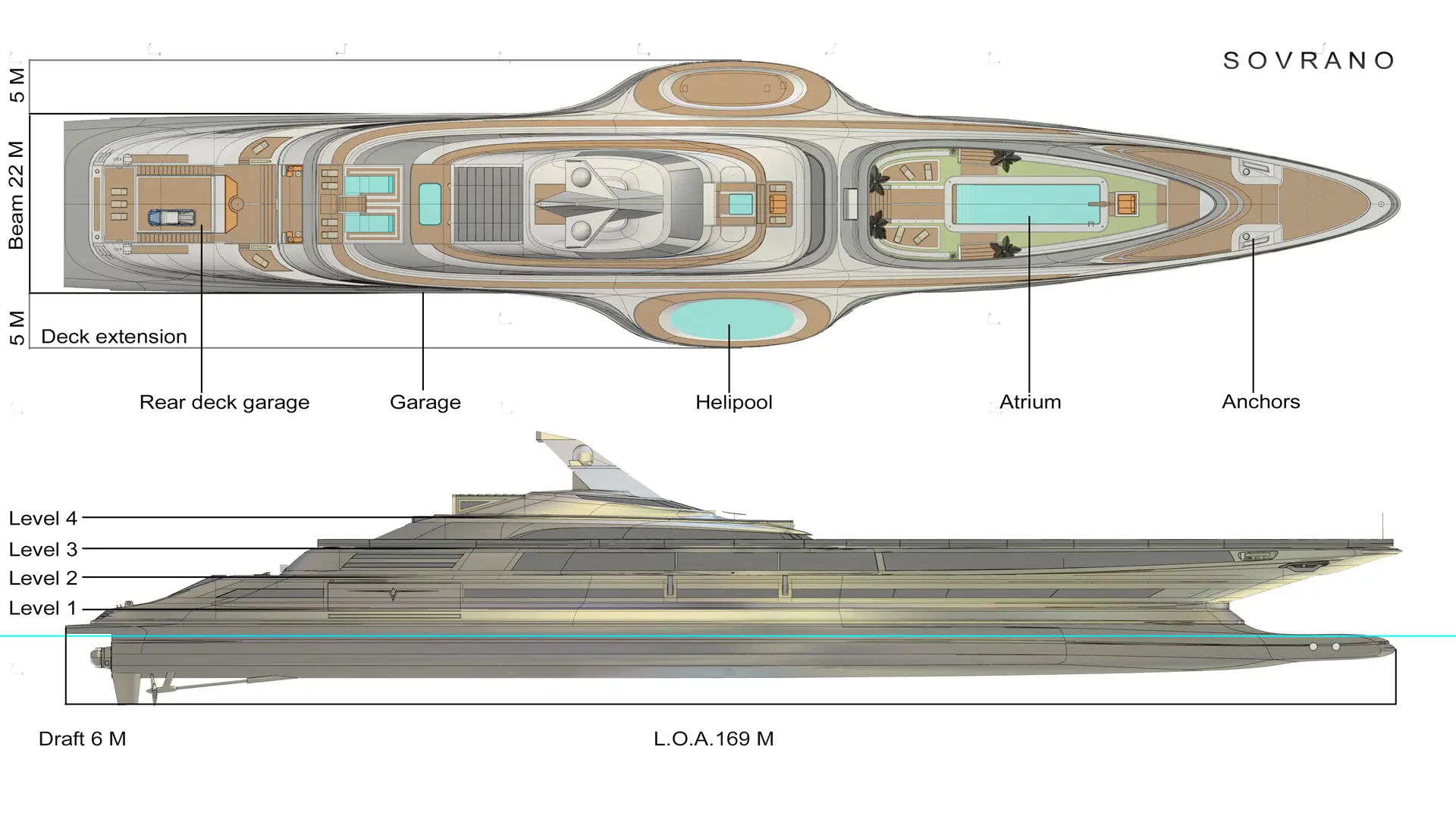 170 metros de eslora, 5 pisos, atrio de tres niveles con techo retráctil que se abre desvelando una piscina y un jardín, dos plataformas en la cubierta principal con el tamaño suficiente para convertirse en helipuertos, más piscinas, más zonas de descanso y solárium, garaje para seis coches y los juguetes náuticos que más te gusten… Y todo ello con espacio para que 50 personas naveguen a placer en este espectacular yate de propulsión híbrida que puede alcanzar la velocidad de 31 nudos. Así es Sovrano, el nuevo concept de Lazzarini.