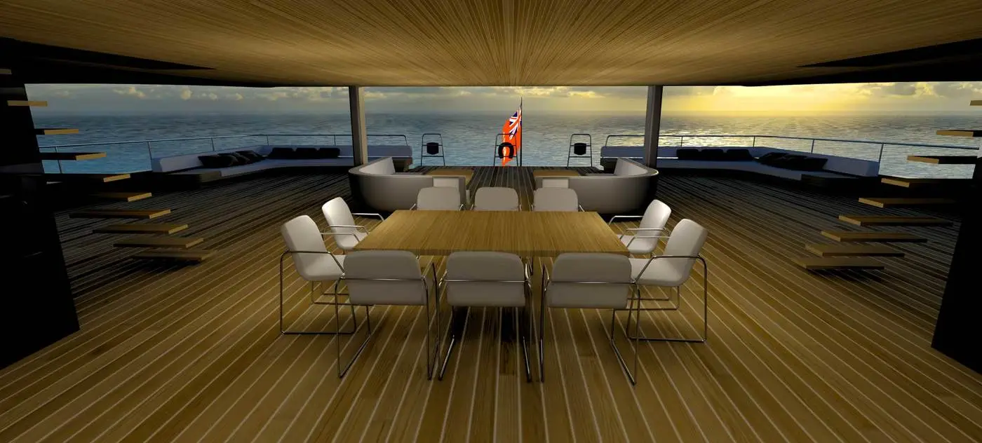 La cubierta de popa tiene unas dimensiones absolutamente fuera de lo común; bajo el alero del flybridge McKeon coloca un salón, que queda así cubierto, y un comedor al aire libre, más a popa cede espacio a unos sofás en forma de L que esconden las escaleras que conducen a las plataformas de baño (la zona de playa del yate).