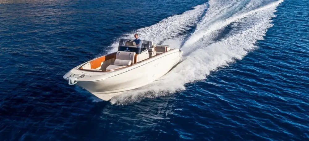 ¿Lo quieres en blanco, en negro o en azul? está disponible en los tres tonos; con 8,7 metros de eslora se construye en fibra de vidrio y, en función de la motorización que elijas, alcanza los 35 o 39 nudos de velocidad máxima: 35 nudos con el motor MerCruiser 3.0 TDI 260 HP Diesel y hasta 39 nudos con el motor Volvo V8 350 HP Benzina.