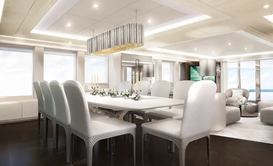 50 metros de eslora, 10 navegantes y otros tantos miembros de la tripulación, la suite principal en cubierta y, más abajo, tres suites dobles y una individual, 5 camarotes para los tripulantes, 250 metros de espacio en cubierta distribuido en tres niveles, 15 nudos de velocidad máxima y 12 de velocidad de crucero… ¿interiorismo? ¿motores? lujo y más lujo, belleza, magia, quimera, ilusión… Maia.