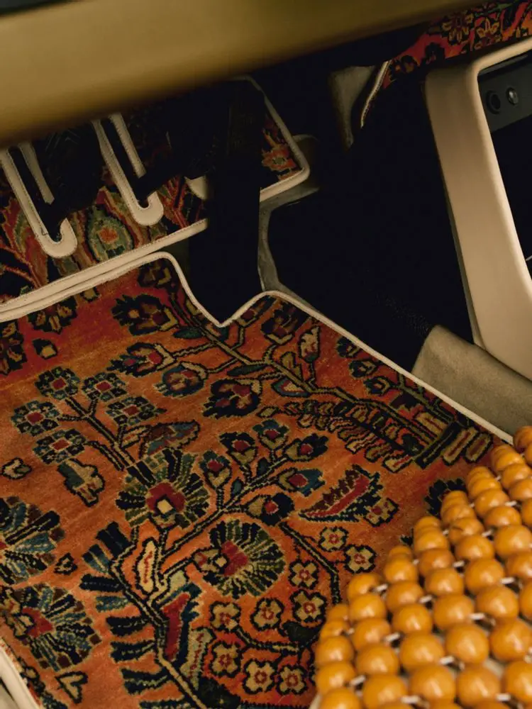 Alfombras persas antiguas en los paneles inferiores de las puertas, alfombrillas y tapizado de ante de búfalo perforado, asientos en boucle con interiores de cuero y cuentas de madera en el del conductor… Y por supuesto, como se trata de un vehículo único, luce una insignia personalizada que reza ALD 911SC.