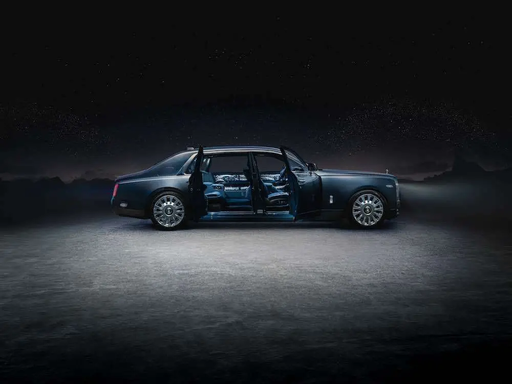 Estamos ante la berlina más grande y lujosa de su clase, un vehículo que, dada su inspiración estelar, no podía pintarse en otro tono que no fuese en un azul noche creado para la ocasión, es el azul Kairos, un tono oscuro y sedoso perlado con escamas de mica para simular el efecto de las estrellas sobre el cielo. Por fuera, además de su pintura, destaca la mítica figura del Espíritu del Éxtasis de Rolls Royce que se presenta con su diseño del 110 aniversario y que, además, cuenta con una placa en la que cada propietario de estas berlinas podrá grabar lo que se le antoje.