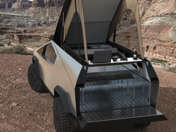 Es nuevo y espectacular vehículo, la Space Camper, utiliza un diseño modular que permite utilizar el mismo espacio como comedor, sala de estar o dormitorio; además utiliza paneles solares para reforzar la batería del Cybertruck (que por supuesto es eléctrico), cuenta además con iluminación LED regulable, calentador de agua instantáneo, estufa de inducción y enfriador eléctrico además de cabina de ducha.