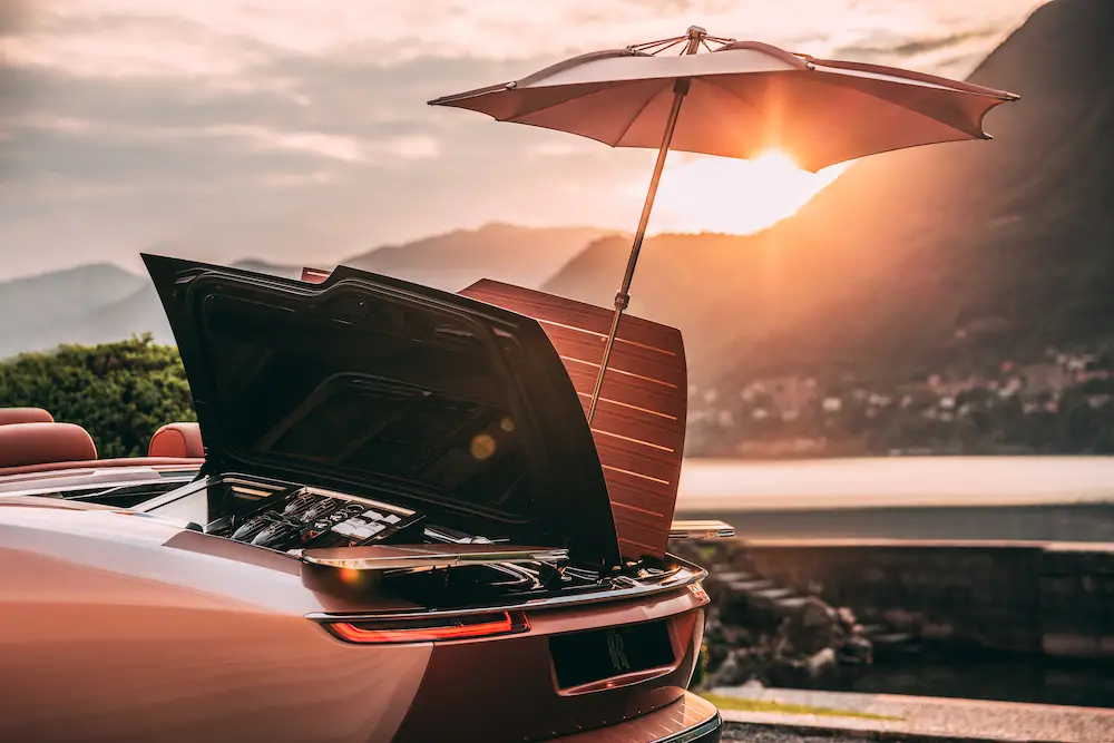 ¿Más detalles deslumbrantes de este Boat Tail? El reloj frontal elaborado con una madreperla brillante, la cubierta trasera de Royal Walnut y por supuesto los secretos que guarda: todos los elementos imaginables para la celebración de una cena o un picnic de lujo al aire libre.